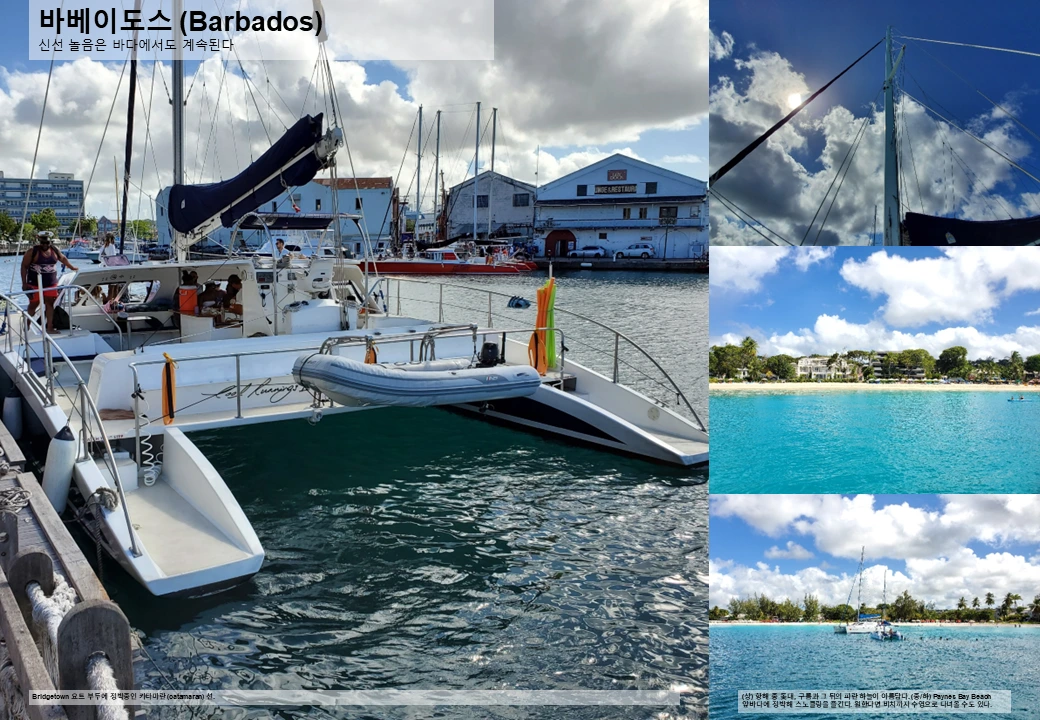 육지에서 충분히 즐겼으니 이제는 바다로 나가볼 차례. 일행과 함께 카타마란 (catamaran) 선에 올라 뱃놀이를 떠났다. 바베이도스 서해안을 따라 주욱 항해하다 스노클링도 즐기고, 배 위에서 샴페인도 함께 즐기다 보니 어느새 한나절이 지난다. 신선 놀음이 따로 없었다.