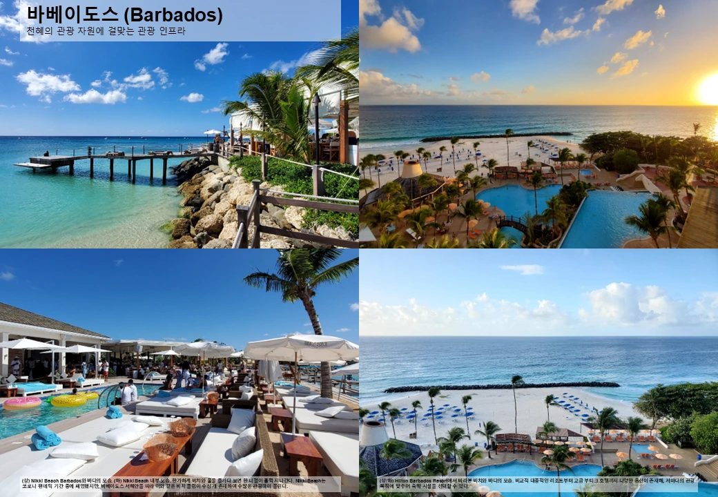 이 천혜의 관광 자원을 사람들이 그냥 둘 리 없다. 바베이도스 전역 (특히 서해안) 에는 관광객을 위한 호텔, 식당, 비치 바 등이 즐비하다. 그래서 이 중 마음에 드는 곳들만 찾아 다녀도 이미 충분한 힐링을 경험할 수 있다.