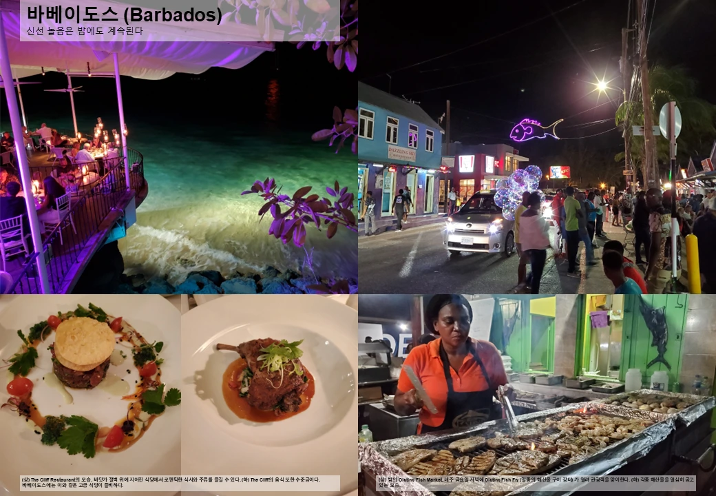 이제 밤이 되었으니 다시 식도락을 즐길 차례. 하지만 바베이도스의 수많은 식당들이 관광객을 기다리고 있으니 급할 것 없다. 매일 다른 식당을 찾아 다른 분위기 속에서 식사를 즐겨 보자. 바베이도스의 신선 놀음은 밤에도 계속된다.