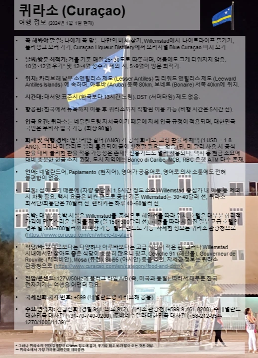 입국 요건: 퀴라소는 네덜란드령 자치국이기 때문에 자체 입국 규정이 적용되며, 대한민국 국민은 무비자 입국 가능 (최장 90일).