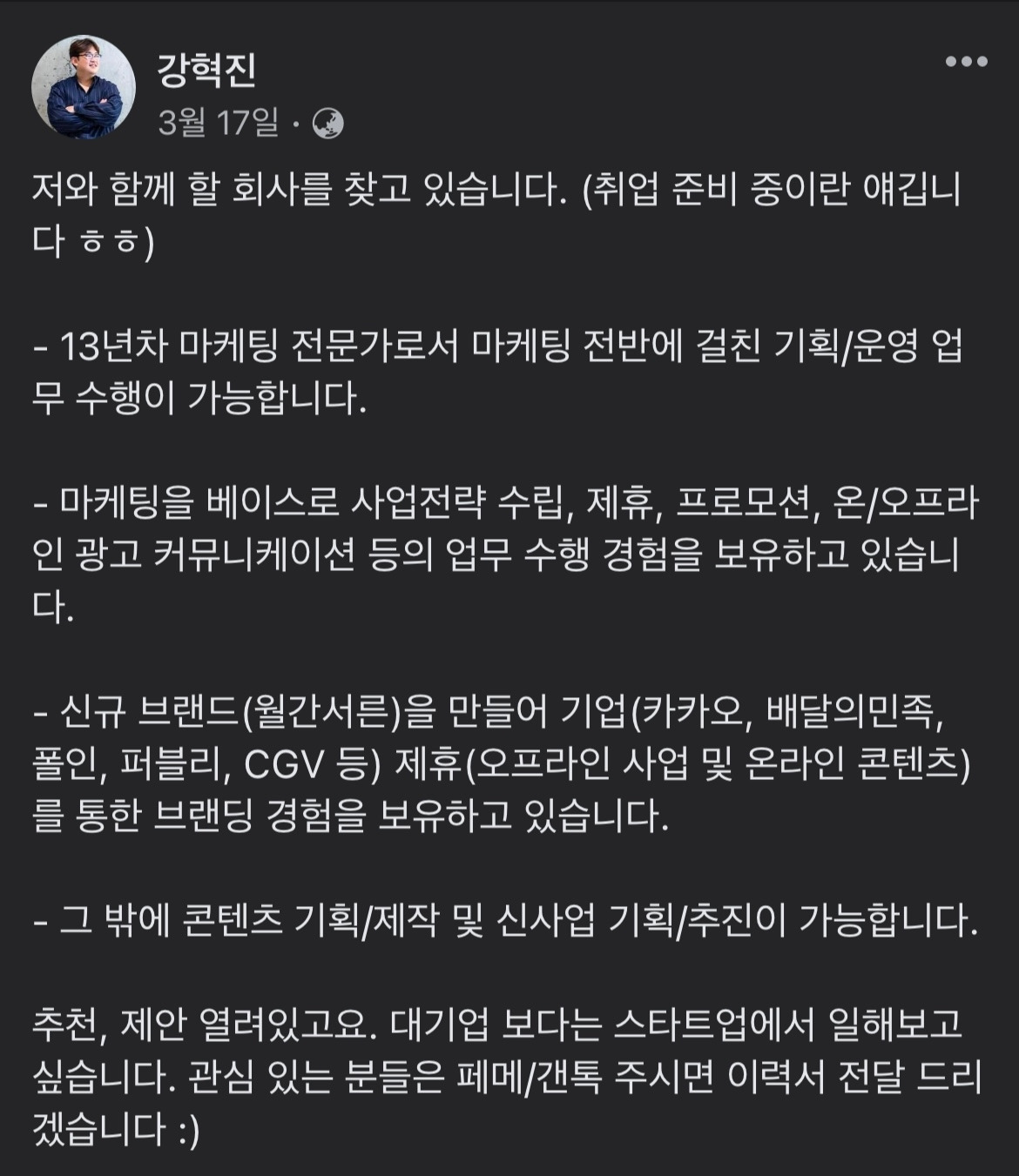 ‘월간서른’ 이라는 브랜드를 만든 강혁진 님은 지난 2022년 4월 1일, 페이스북을 통해 짧은 글을 올렸는데 잔잔한 감동이 되었습니다. 지난 4년 간 월간서른 브랜드의 신뢰자산이 쌓여 이번 공개 입사 희망 글을 올린 후 60 건의 연락, 30 건의 미팅을 했다는 이야기였습니다.