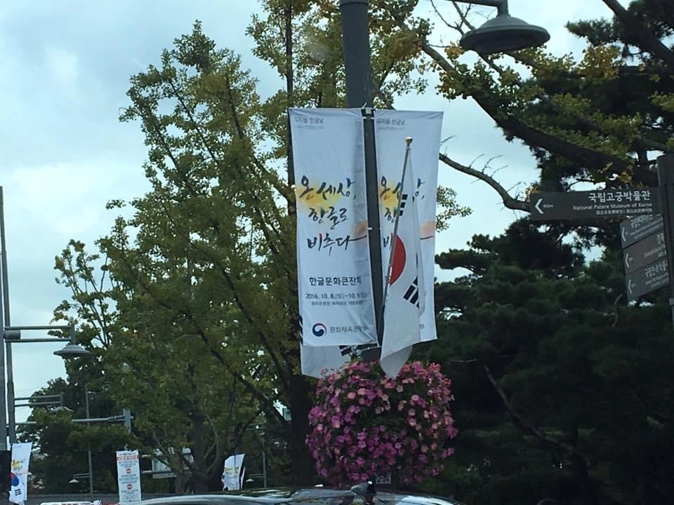 2. 광화문에 왔는데 2016 한글날 행사 준비가 한창이다. 깃발들에 내 글씨가 보여서 감사.