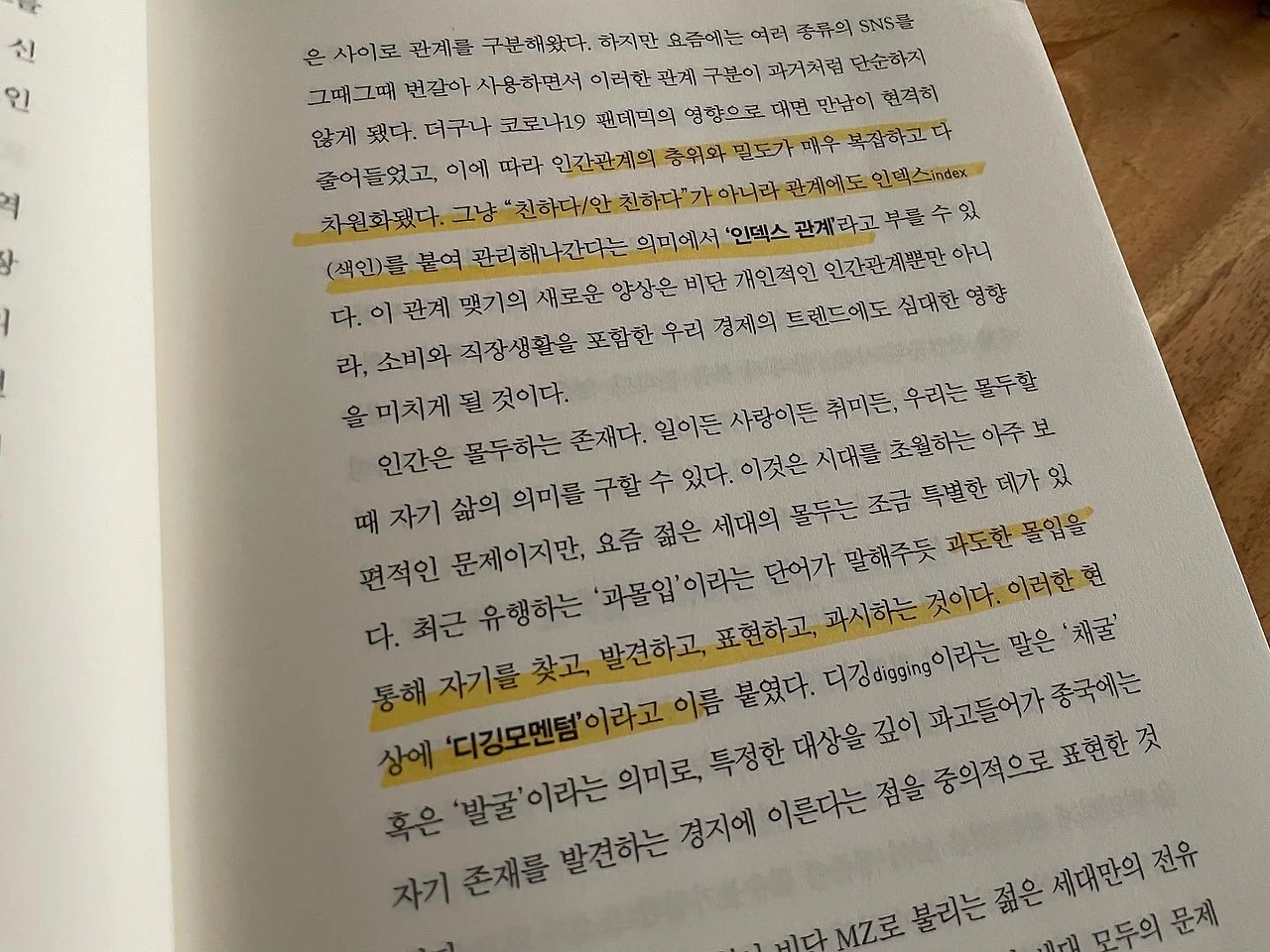 ‘그냥 “친하다/안친하다”가 아니라 관계에도 인덱스 index(색인)를 붙여 관리해나간다는 의미에서 ‘인덱스 관계’라고 부를 수 있다. 과도한 몰입을 통해 자기를 찾고, 발견하고, 표현하고 과시하는 것이다. 이러한 현상에 ‘디깅모멘텀’이라고 이름을 붙였다. 디깅 digging 이라는 말은 ‘채굴’ 혹은 ‘발굴’ 이라는 의미로, 특정한 대상을 깊이 파고들어가 종국에는 자기 존재를 발견하는 경지에 이른다는 점을 중의적으로 표현한 것이다.’ 13p