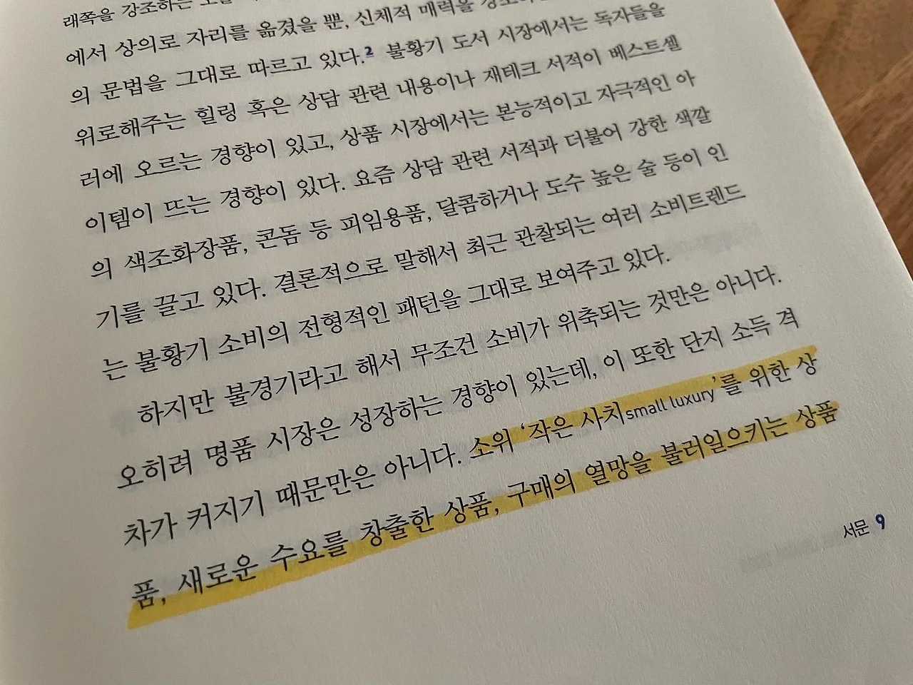 ‘오히려 명품 시장은 성장하는 경향이 있는데, 이 또한 단지 소득 격차가 커지기 때문만은 아니다. 소위 작은 사치 small luxury를 위한 상품, 새로운 수요를 창출한 상품, 구매의 열망을 불어 일으키는 상품. 인간관계의 층위와 밀도가 매우 복잡하고 다차원화 됐다.’ 9p