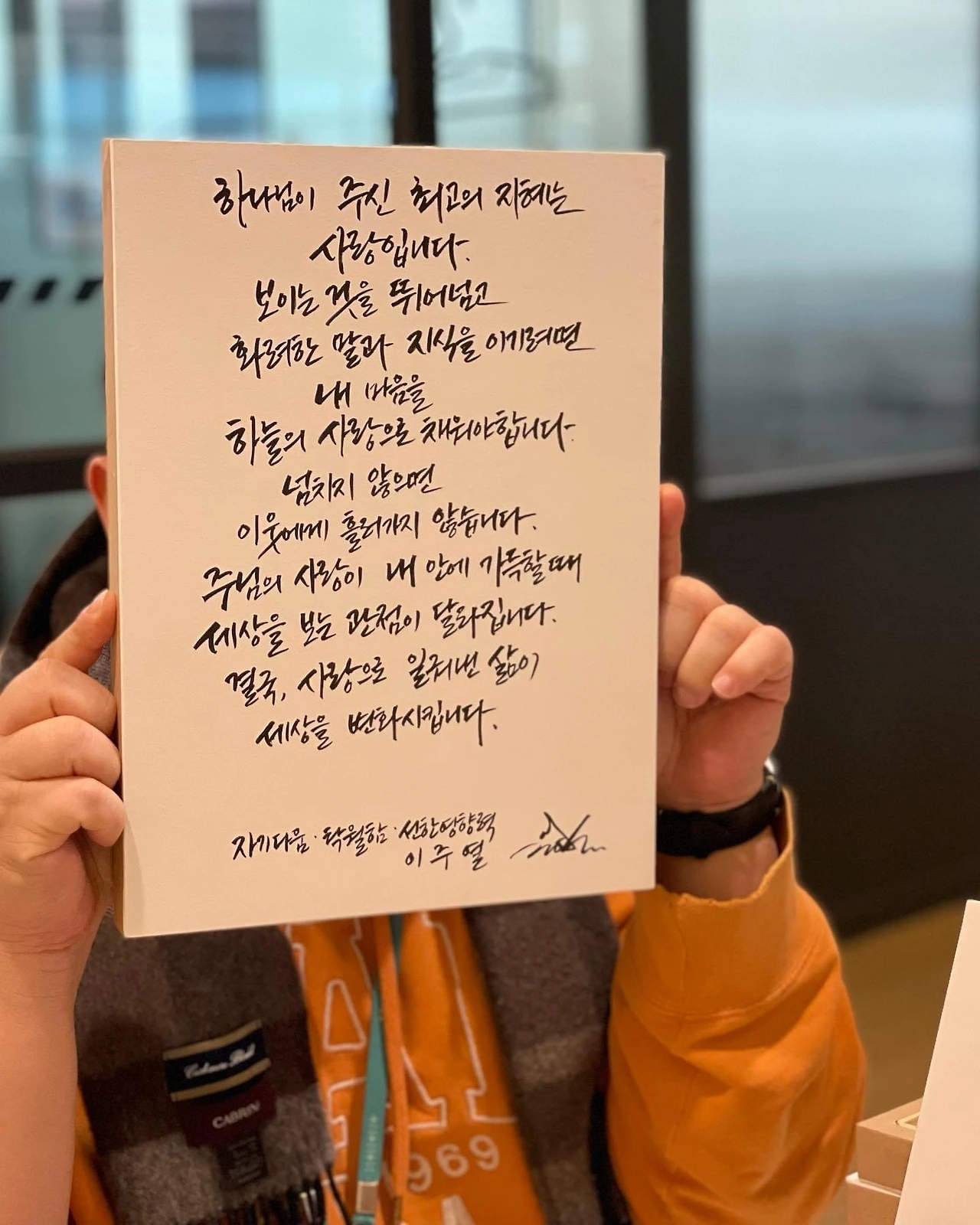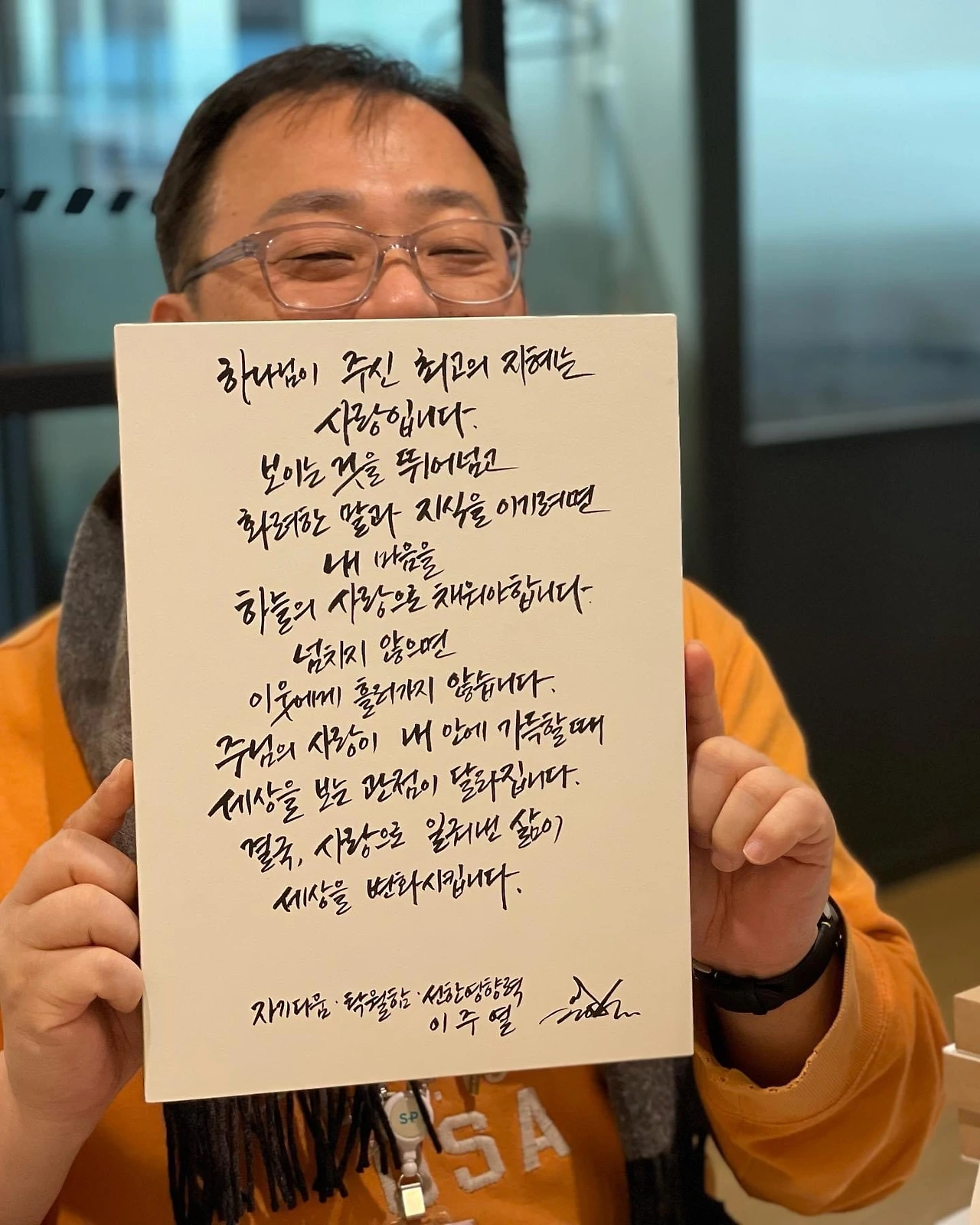 “하나님이 주신 최고의 지혜는 사랑입니다. 보이는 것을 뛰어넘고 화려한 말과 지식을 이기려면 내 마음을 하늘의 사랑으로 채워야 합니다. 넘치지 않으면 이웃에게 흘러가지 않습니다. 주님의 사랑이 내 안에 가득할 때 세상을 보는 관점이 달라집니다. 결국, 사랑으로 일궈낸 삶이 세상을 변화시킵니다.” _ 자기다움 탁월함 선한 영향력 + 바보 이주열