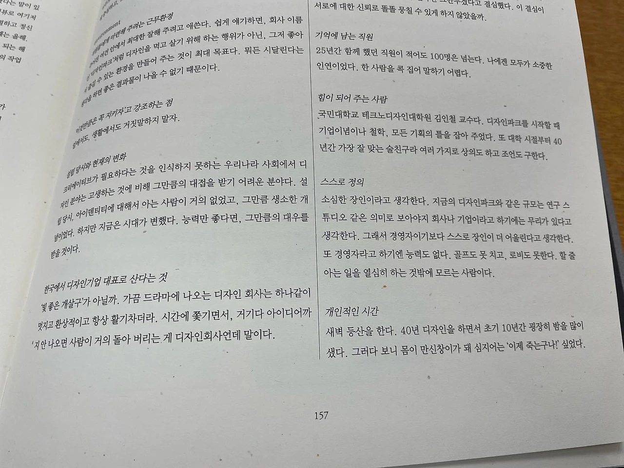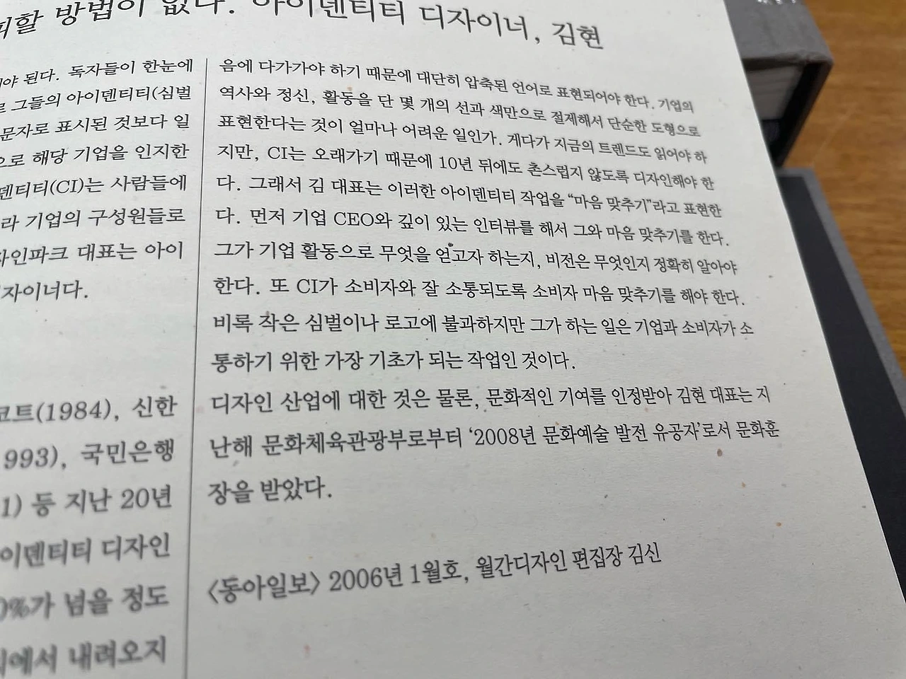 “CI는 오래가기 때문에 10년 뒤에도 촌스럽지 않도록 디자인해야 한다. CEO와 마음 맞추기를 한다. 소비자 마음 맞추기를 한다. 비록 작은 심벌이나 로고에 불과하지만 그가 하는 일은 기업과 소비자가 소통하기 위한 가장 기초가 되는 작업인 것이다” 179p