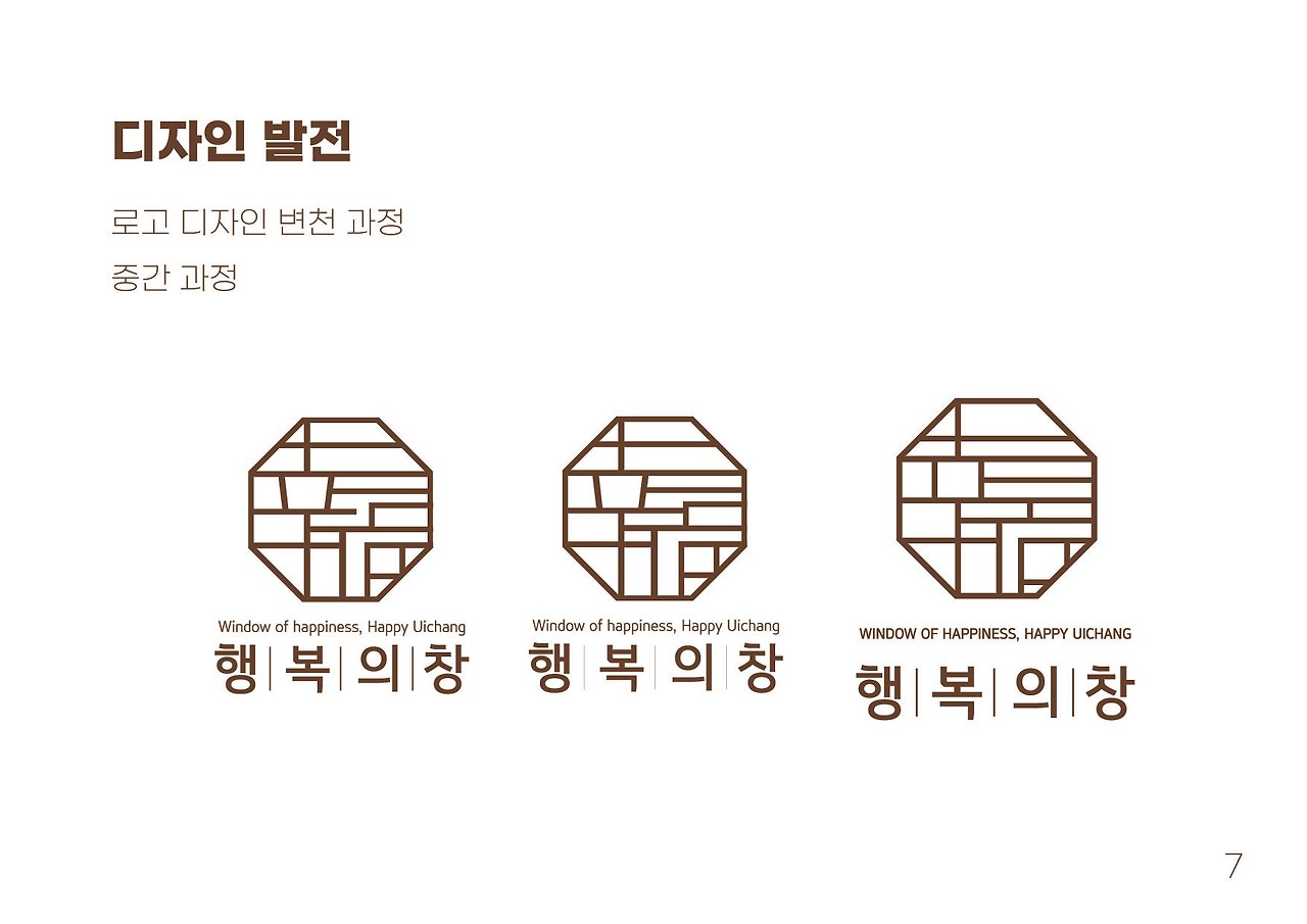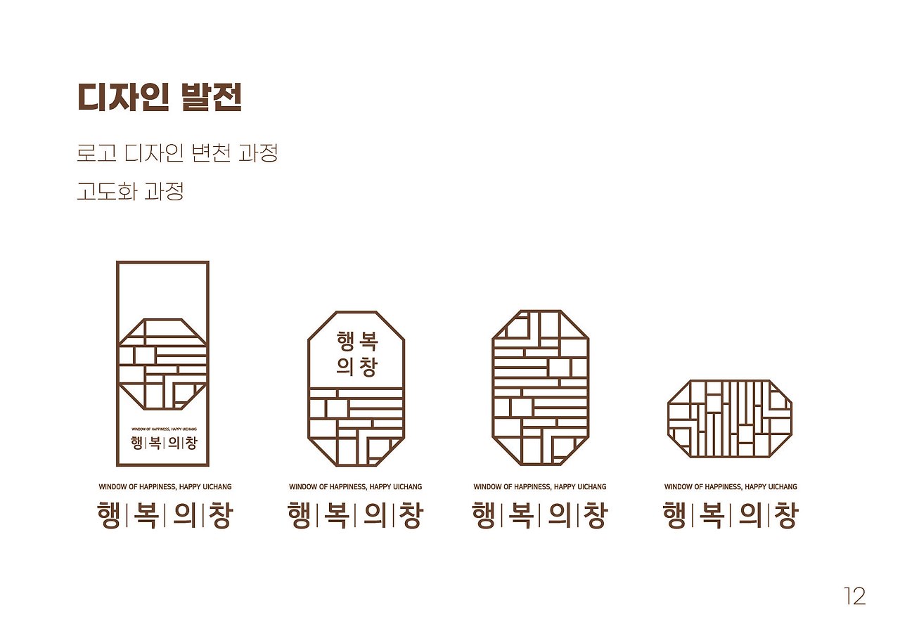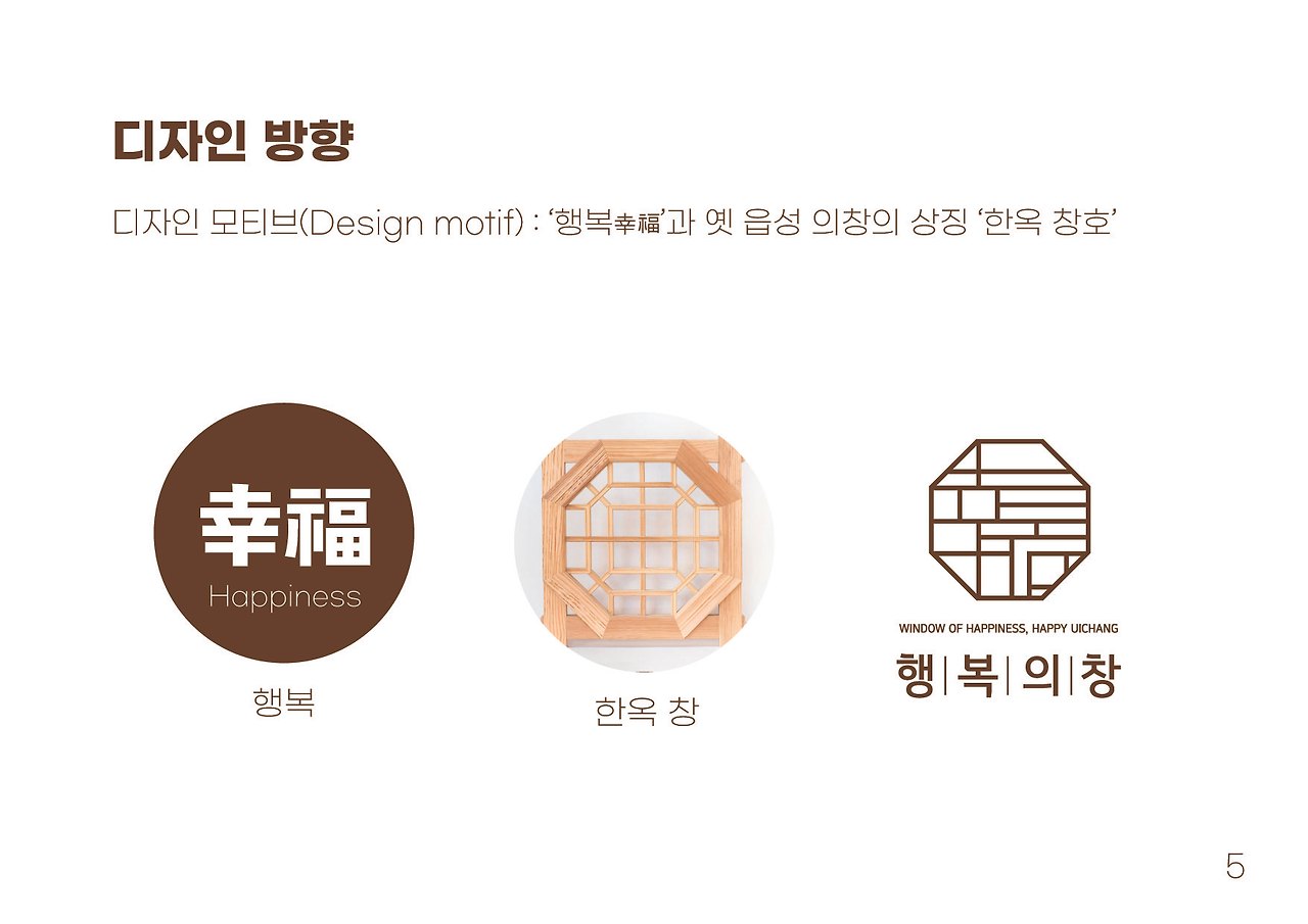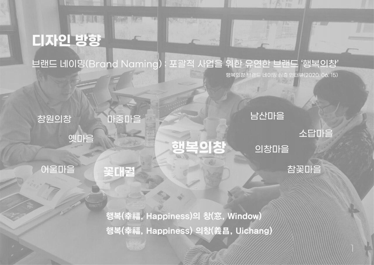행복의창 이라는 브랜드는 창원의 '의창구' 이름을 포함하여 디자인하게 되었습니다. 주민들의 의견에 따라 지역의 콘텐츠인 김종영 생가의 한옥, '행복'이라는 한자를 심벌로 넣었습니다.