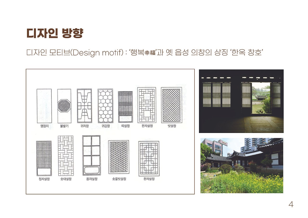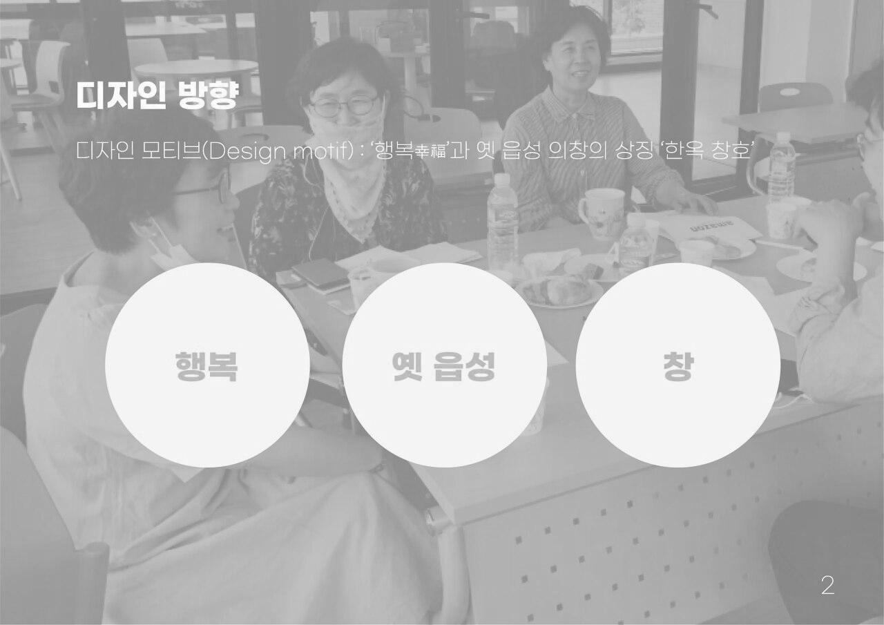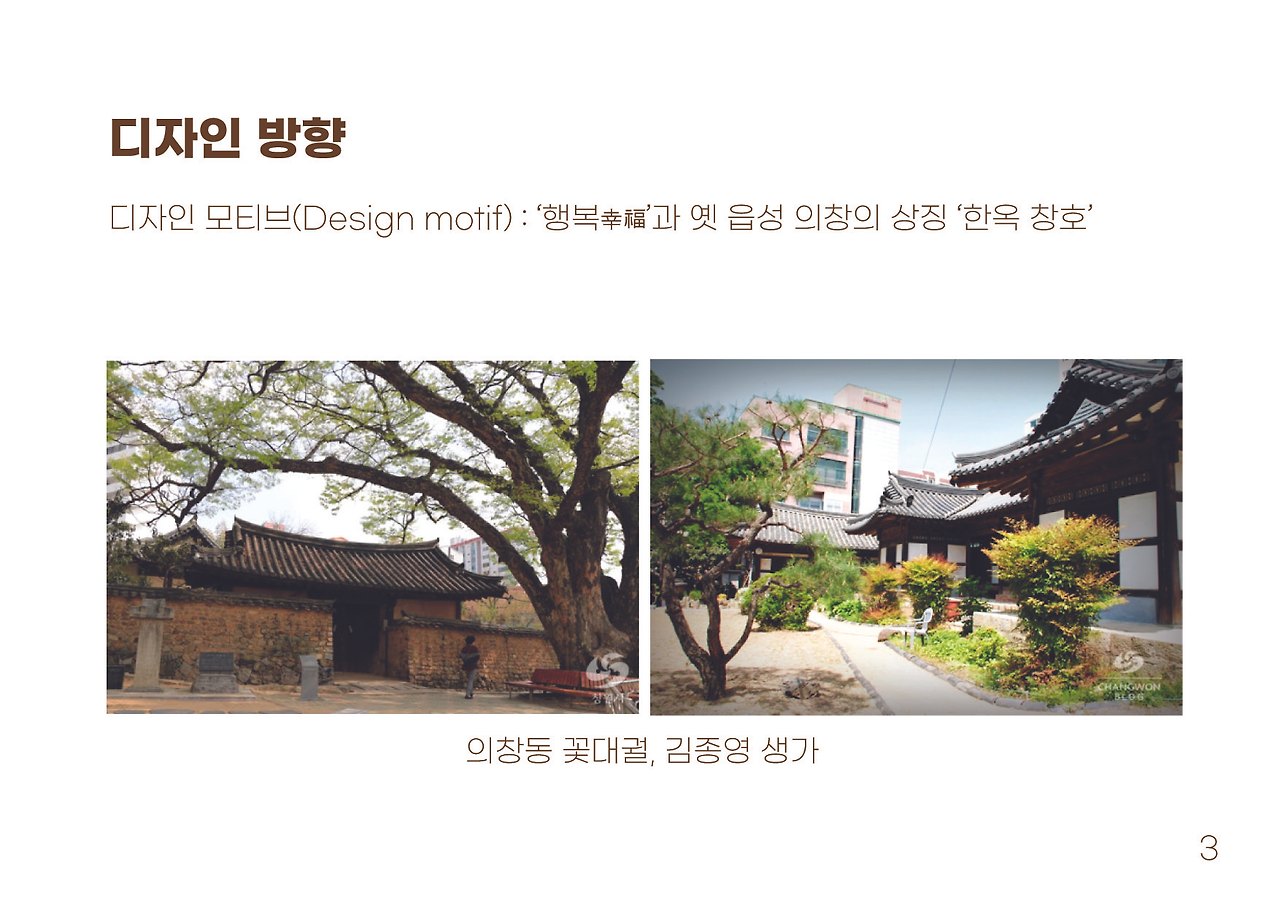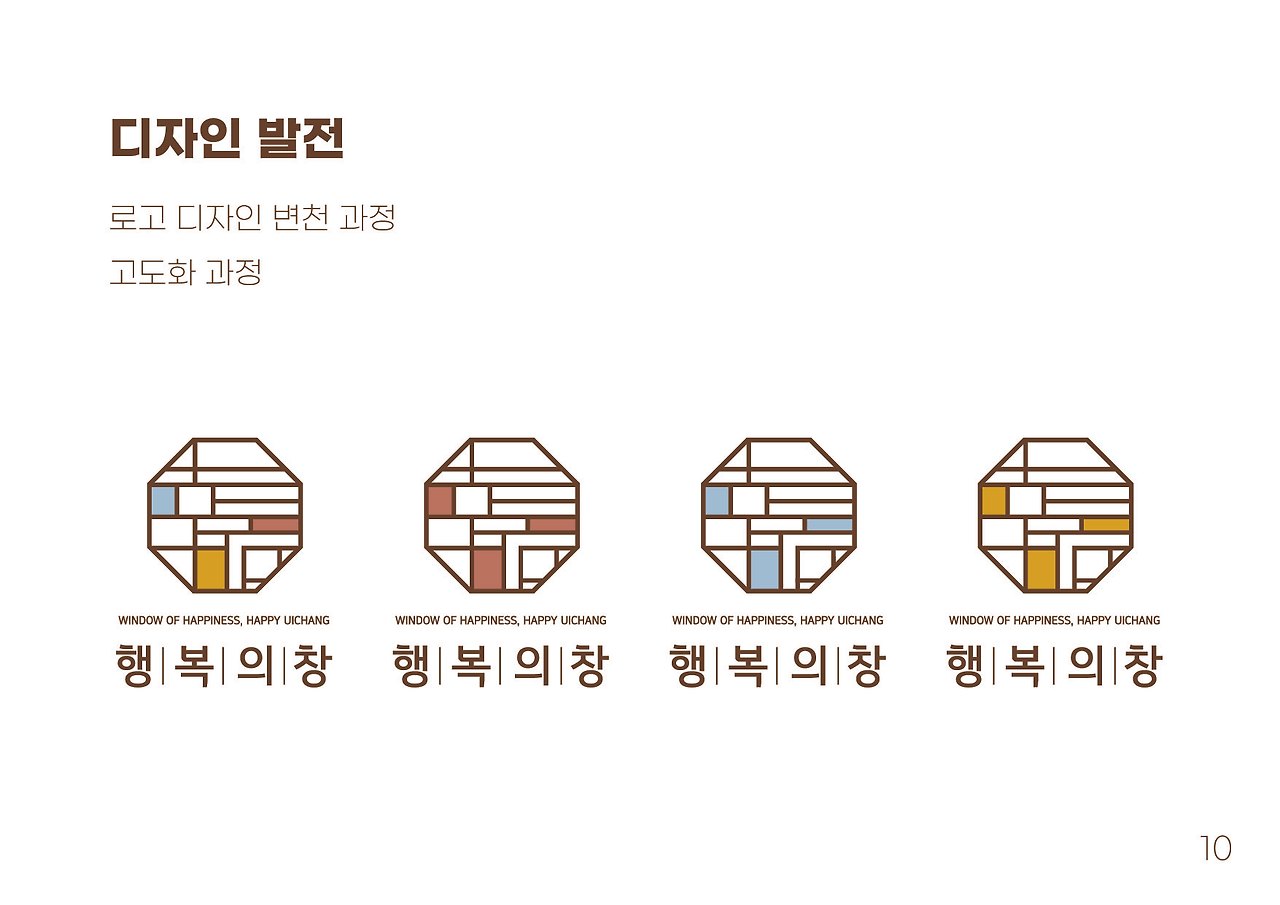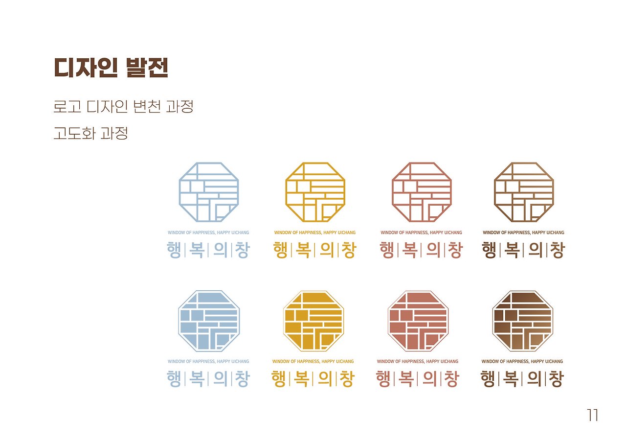 행복의창 이라는 브랜드는 창원의 '의창구' 이름을 포함하여 디자인하게 되었습니다. 주민들의 의견에 따라 지역의 콘텐츠인 김종영 생가의 한옥, '행복'이라는 한자를 심벌로 넣었습니다.