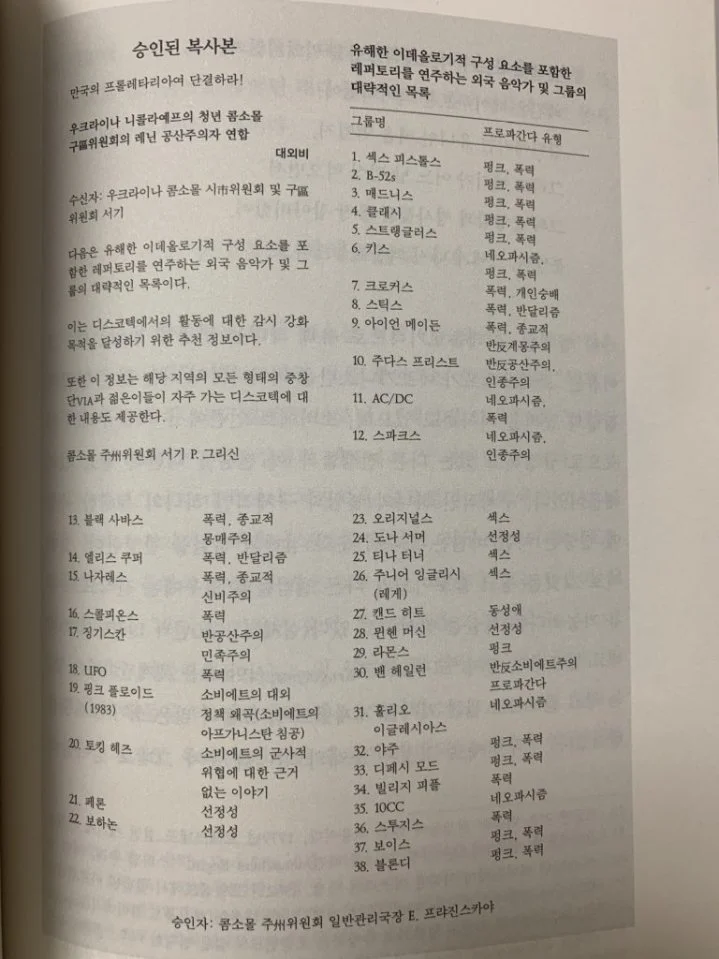 퇴폐적인 서구 자본주의 문화에 대한 금지 리스트를 작성하던 소련 검열관들은 사실 보통의 서구 사람들보다 더 서구 문화에 해박한 서구 문화 전문가들이었다. 그들이 작성한 리스트는 메탈리카, 주다스 프리스트, 핑크 플로이드의 음악과 같은 서구 문화 상품에 대한 추천 가이드북이나 다름없었다. 당대에 가장 잘나갔던 음악가가 누구인지 알아보려면 당시 소련에서 누구의 음악을 금지하는지를 알아보면 되었다. 그러한 검열 규정의 함의, 즉, 어떤 음악이, 영화가 사회의 '미풍양속'에 해가 된다는 규범적 표명, 그것들이 모종의 규범적 정상성을 넘어선 과잉을 표현한다는 사실은 그것들이 아무런 독기도, 과감함도 품지 않은 관제 예술보다 진짜에 가까운 예술임을 의미하는 것이었다. 사회주의 이데올로기의 순수성을 지키고자 했던 소련 당국자들의 노력에도 불구하고 소련 인민들은 그야말로 수단과 방법을 가리지 않고 서구 록밴드들의 음악을 찾아 들었다. 그 중 한 방편은 후대에 이른바 bone music 또는 ribs라 알려진 것이었는데, 병원에서 폐기된 엑스레이 필름을 잘라 LP판으로 가공한 것이었다.