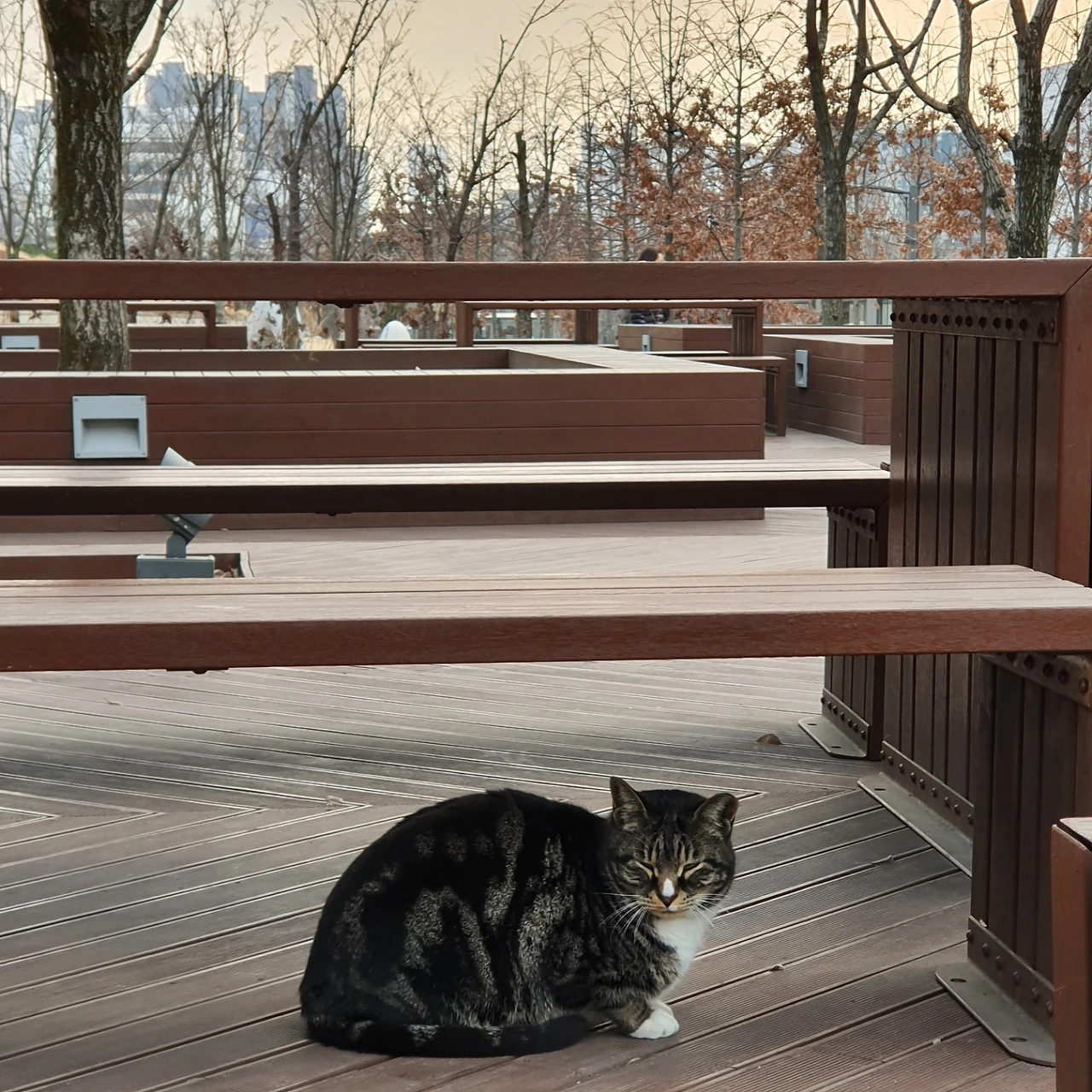 어슴푸레 눈을 뜨고 있는 검은 고양이. 요 녀석은 사람을 마주쳤는데도 미동 하나 없다. 쳐다보는 둥 마는 둥 여러 사람들을 이미 지나쳐 보낸 듯하다. 앞에서 볼 때는 몰랐는데, 옆을 지나가다 보니 배가 불룩하다. 조용한 눈빛으로 참치캔을 몇 번이나 얻어먹은 게 분명하다. 아무튼 귀여운 고양이다.