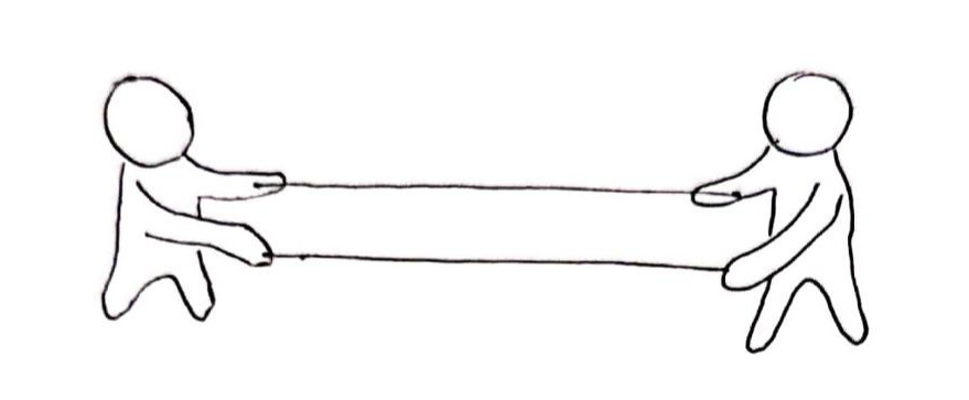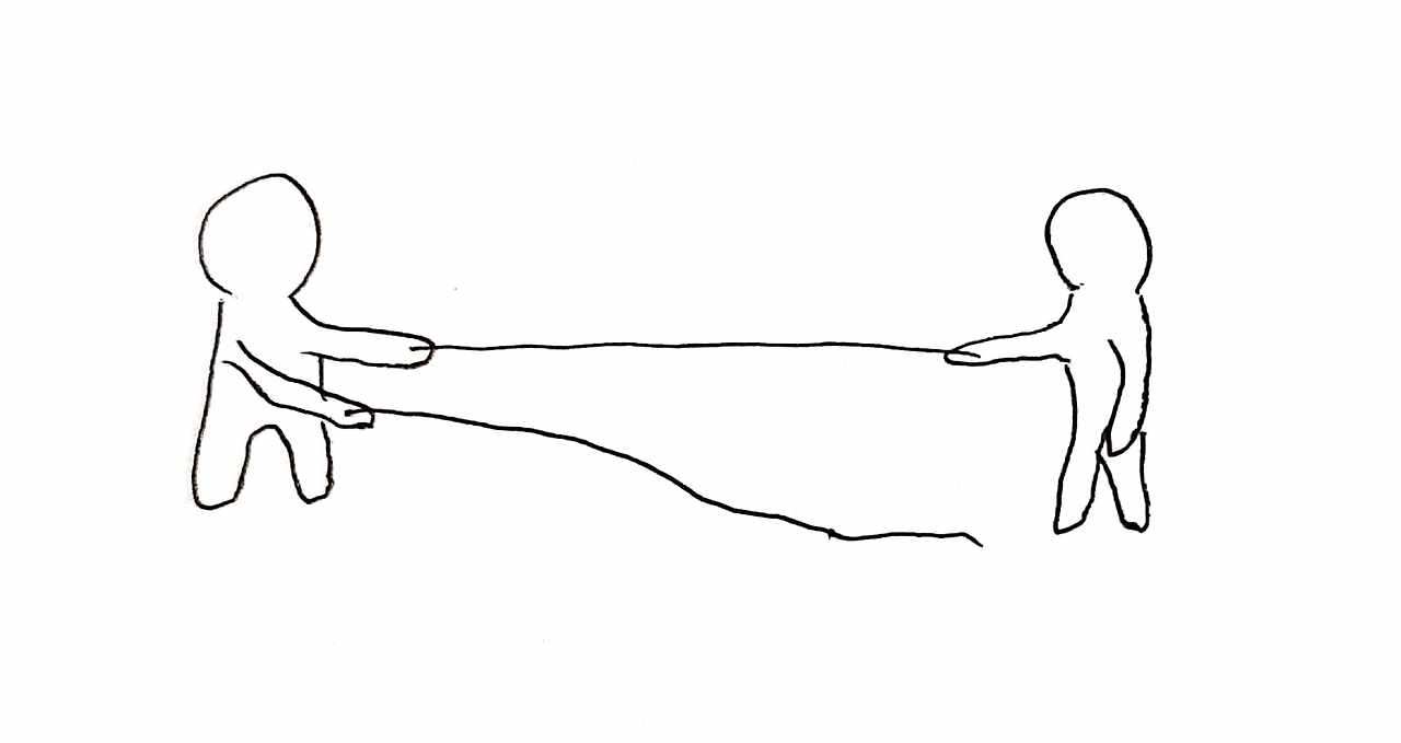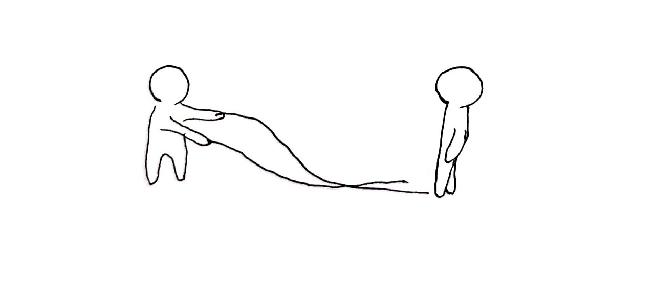 3번 그림이다. 여기서는 B가 2개의 끈 중 하나를 놓은 것을 볼 수 있다. 여기서 우리는 어떤 이유로든 둘 사이에 신뢰가 약해졌다는 것을 추측할 수 있다. 둘이 원래 긴밀한 사이였는데 사이가 틀어졌을 수 있고, 원래 깊은 사이는 아니었지만 관계 면에서 흔들린 것일 수도 있다. 그림에서 A는 두 끈을 모두 잡고 있으나 B는 하나의 끈을 놓았다. 이 사실 하나만으로도 여러 생각을 해볼 수 있다.