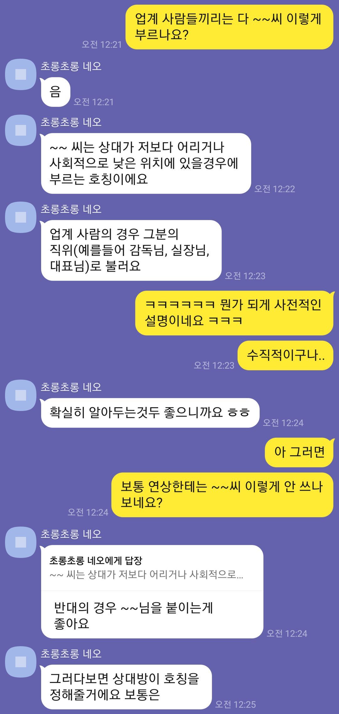 하지만 소통할 때 나이를 구분하여 부르지는 않았다. 모두가 "~~ 씨"와 "~~ 님"을 섞어서 부르고 있었다. 나는 "~~ 님"은 극 존칭이고 오히려 거리감이 느껴지는 것 같아 "~~ 씨"를 주로 사용했는데, 서로 나이를 다 밝힌 상황이었다면 내쪽에서는 "~~ 님"이라고 부르는 편이 더 나았을 것이다.