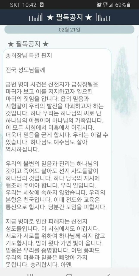 언론보도에 따르면 이만희 총회장은 21일 ‘총회장님 특별편지’라는 제목의 공지 글에서 “금번 병마 사건은 신천지가 급성장됨을 마귀가 보고 이를 저지하고자 일으킨 마귀의 짓이다. 욥의 믿음과 시험같이 우리의 발전을 파괴하고자 하는 것”이라고 사태를 평가했다. 이 총회장은 “우리는 하나님의 씨로 난 하나님의 아들이며 하나님의 가족이다. 이 모든 시험에서, 미혹에서 이깁시다”라고 말했다. 책임 있는 종교인이라면 사과가 먼저이고, 질병 확산을 막기 위해 교회 차원에서 할 수 있는 일을 다 하겠다고 선언하는 게 합당했을 것이다.