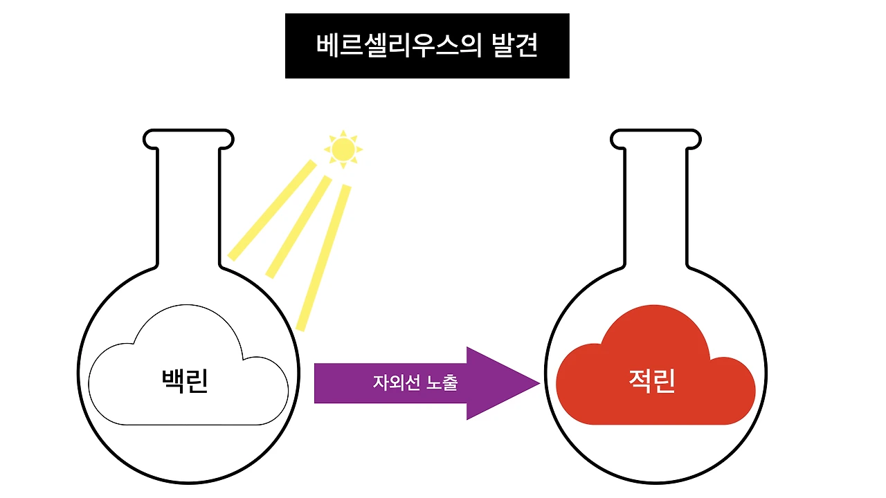 베르셀리우스는 자신의 실수를 다시 되짚었습니다. 커튼을 치지 않고 나갔기 때문에 백린은 태양의 자외선에 노출될 수 밖에 없었습니다. 태양의 자외선은 백린의 성질을 바꿨습니다. 인의 색상을 흰색에서 붉은색으로 바꾼것이지요. 그러나 여전히 이 물질은 인이었습니다.