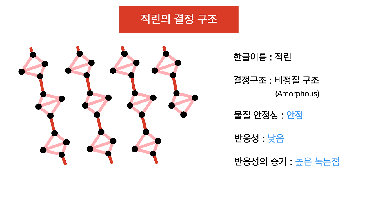 적린의 결정구조는 비정질 구조입니다. 비정질 구조란 원자 배열의 규칙성을 찾기 힘든 구조를 이야기합니다. 적린은 백린과 달리 훨씬 복잡한 결정구조를 갖고 있습니다. 중요한 것은 백린보다 서로 붙어있는 원자의 수가 많다는 점입니다. 따라서 적린의 결정구조는 백린보다 좀더 치밀합니다. 치밀한 적린의 결정구조로 적린은 다른 물질과 잘 반응하지 않습니다. 즉, 적린은 백린보다 낮은 반응성을 갖습니다!