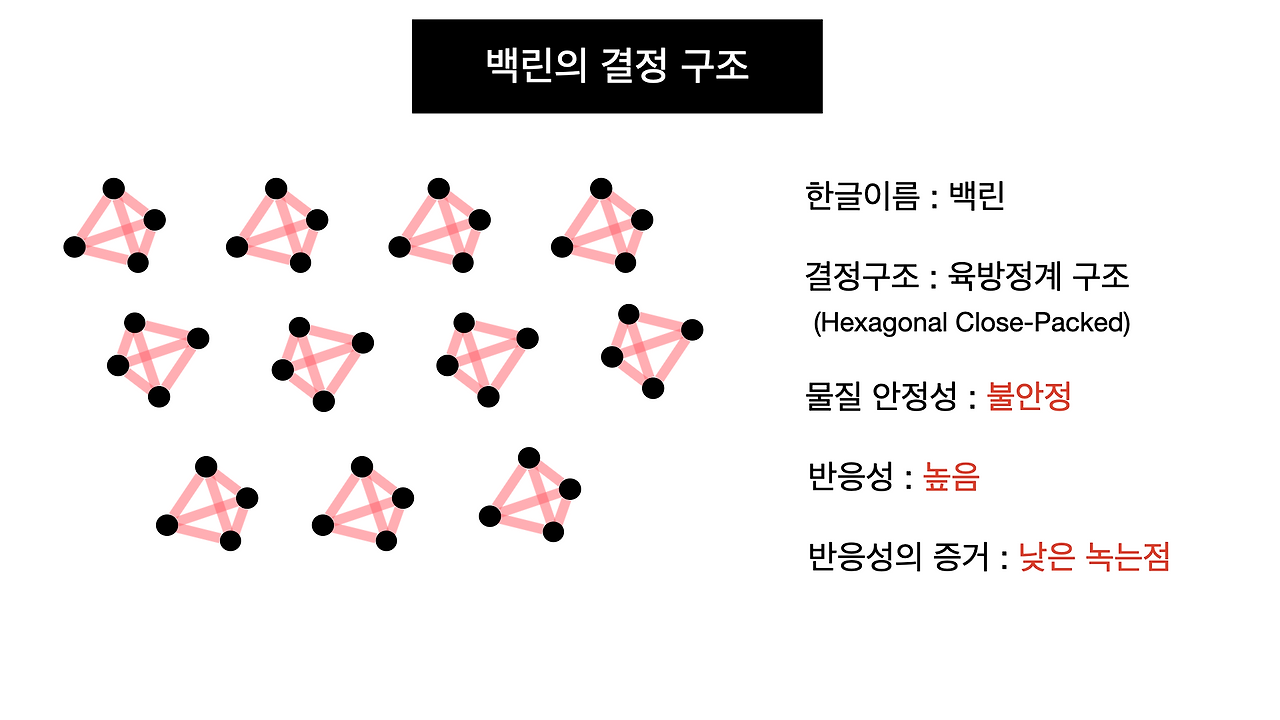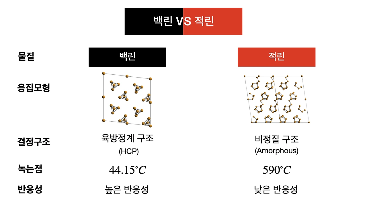 백린은 반응성이 높습니다. 불안정한 결합구조 때문이죠. 높은 반응성은 낮은 녹는점(44.15도)을 갖는다는 사실로 확인할 수 있습니다. 반면, 적린은 백린보다 반응성이 낮습니다. 안정적인 비정질 구조 덕분이죠. 낮은 반응성은 높은 녹는점(590도)로 확인할 수 있습니다. 결정구조의 차이가 반응성의 차이를 만든 것입니다.