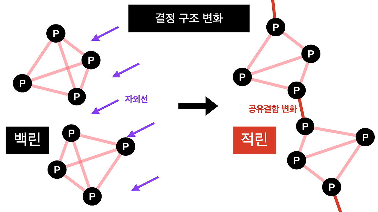 백린의 결정구조는 육방정계 구조입니다. 4인 분자(4P Molecule)들이 정육각형을 밑면으로 하는 프리즘같은 모양으로 뭉쳐있는 겁니다. 육방정계 구조가 불안정하진 않지만, 백린을 이루는 4인 분자는 매우 불안정합니다. 따라서 백린은 공기에 포함된 산소와 반응하여 격렬한 연소반응을 일으킵니다. 즉, 백린은 높은 반응성으로 아주 손쉽게 불이 붙을 수 있습니다. 이러한 백린에 자외선이 들어오자 결정구조의 변화가 일어납니다.