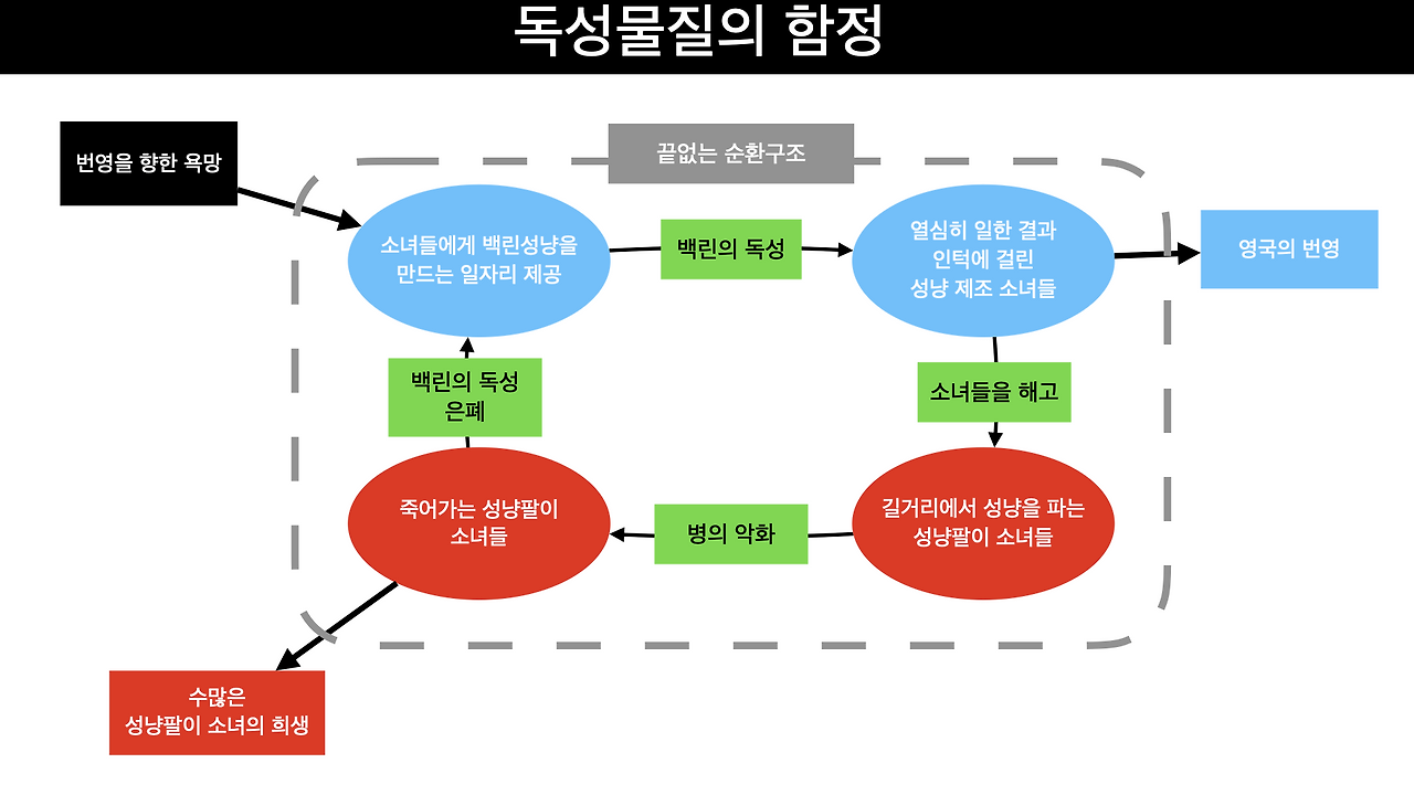 독성물질의 함정에 빠진 영국은 희생과 번영을 맞바꿀 수 밖에 없었습니다. 열심히 일한 성냥 제조 소녀들은 영국의 번영에 기여했지만, 인턱에 걸려 죽어갔습니다. 백린의 독성이 소녀를 죽게 만든 것이었지만, 아무도 책임질 필요가 없었습니다. 비밀이 지켜진 덕분에, 화학적 지식이 없는 사람들은 백린이 독성물질이란 진실을 전혀 알 수 없었습니다.