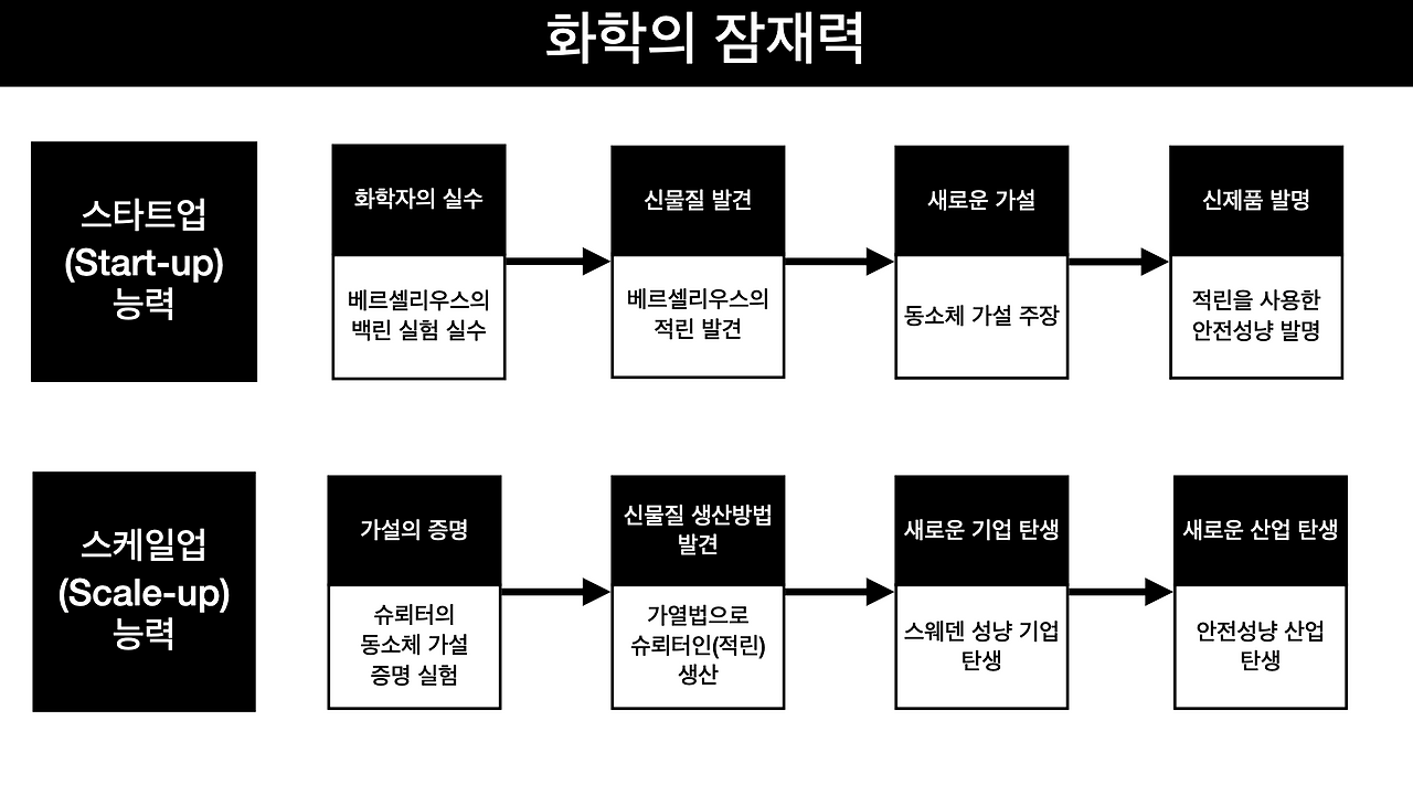 스웨덴 사람들의 해결책은 새로운 시장을 개척하는 것이었습니다. 백린성냥을 대체할 안전성냥 시장을 탄생시키는 것이죠. 그들이 새로운 시장을 개척할 수 있었던 것은, 화학이 가진 2가지 잠재력 덕분이었습니다.