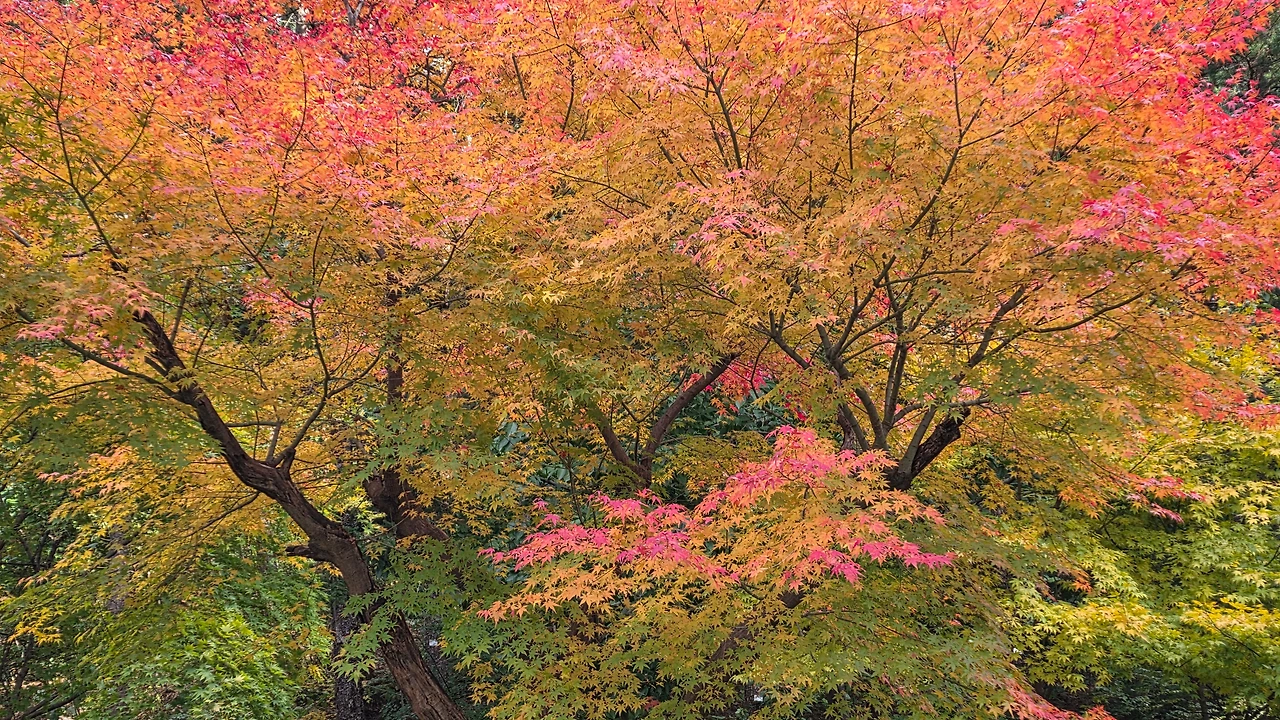 동네 공원에 있는 화사한 단풍나무 한그루,