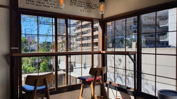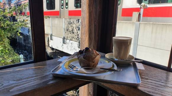 10평도 안되는 공간에 원목과 화이트 인테리어로 차분하면서도 햇살 가득한 따뜻한 곳이에요. 특히 카페 큰 창 옆으로 가까이 지나가는 전철 풍경을 감상할 수 있답니다.