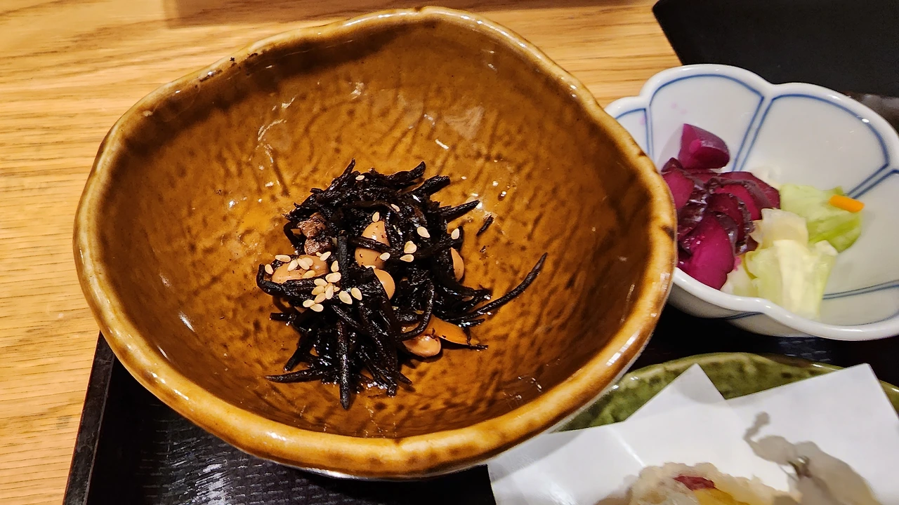 일본에서는 이렇게 메인 요리에, 하얀 쌀밥과 일본식 된장국인 미소시루 그리고 한두 가지 리필 안 되는 소량의 야채절임 반찬 세트로 나오는 것을 정식 (定食、테-쇼쿠)라고 합니다. 주로 반찬으로 준거겠지 싶은 것들로 나오는 것은 톳으로 만든 맹맹한 맛의 나물(일본말로는 히지키)과 빨갛게 물든 피클 같은 것인데 항상 김치와 어묵볶음 같은 밑반찬이 그리워지는 순간이죠.