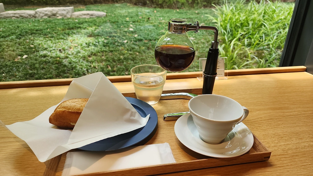 저의 점심은 1500엔 세트 메뉴 바질소스와 촉촉한 치킨이 들어간 바케트 핫샌드와 사이폰 커피입니다. 닌텐도 게임 모여라 동물의 숲에서 부엉이 아저씨가 내려 준 커피가 사이폰 커피였군요. 점심이라고 생각하면 그렇게 비싼 값은 아닌 것 같은데..