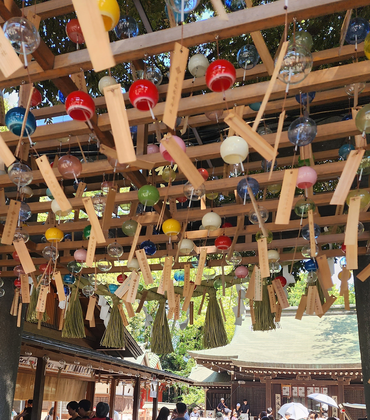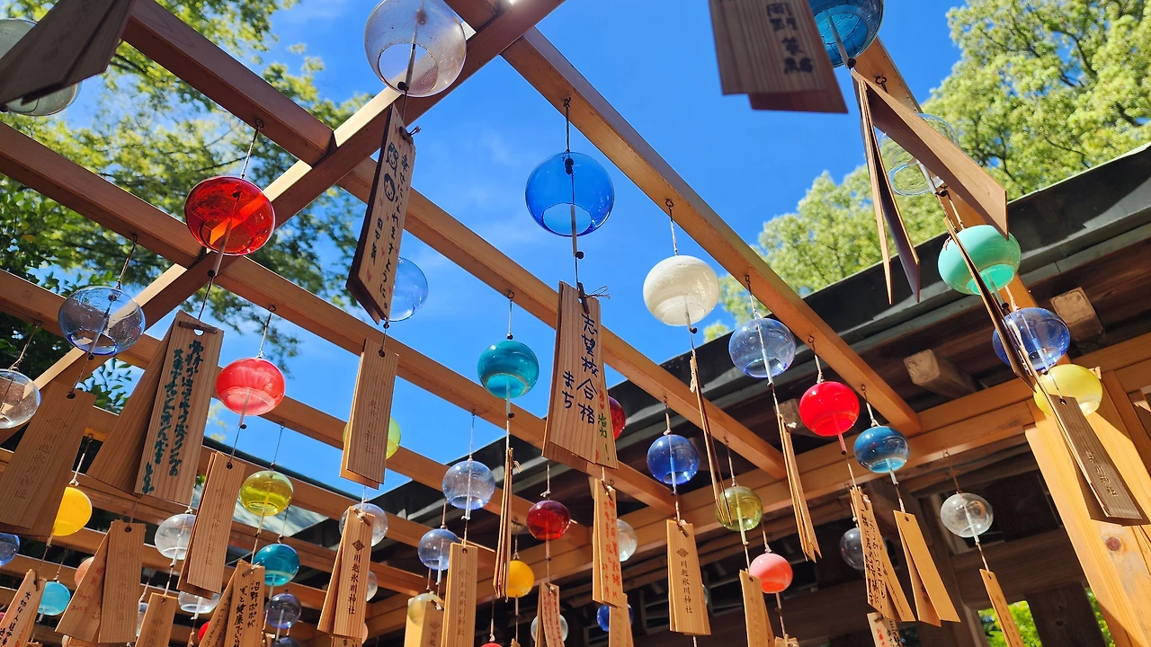 신사 안에 종종 시원하게 불어오는 여름 바람에 알록달록 차랑거리는 풍경 소리가 기분이 참 좋습니다. 차랑 차랑한 소리가 꼭 매달려 있는 소원들이 이루어지는 주문 같기도 하고요.