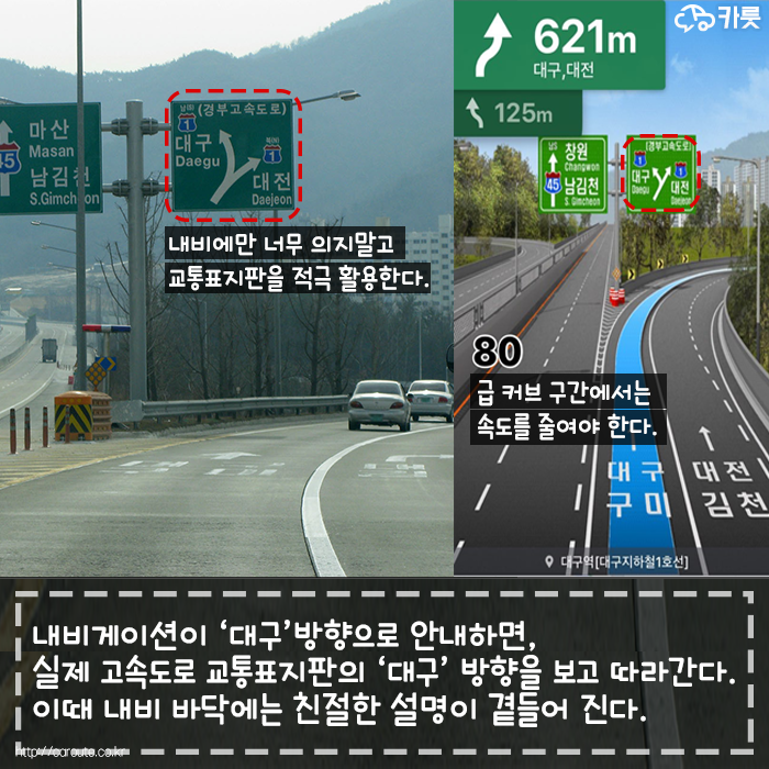내비게이션만을 보고 운전하는 운전자가 적지 않다. 왜냐면 너무 좋다. 인정할 수밖에 없다. 하지만 처음에는 익숙하는데 까지 시간이 조금 필요하다. 이때 도로의 이정표, 교통 표지판, 노면 표시 등을 보는 방법을 조금 익혀두면 더 운전 능력을 향상할 수 있다. ('내비게이션 길 안내 놓치지 않을 거예요.' - 카룻)