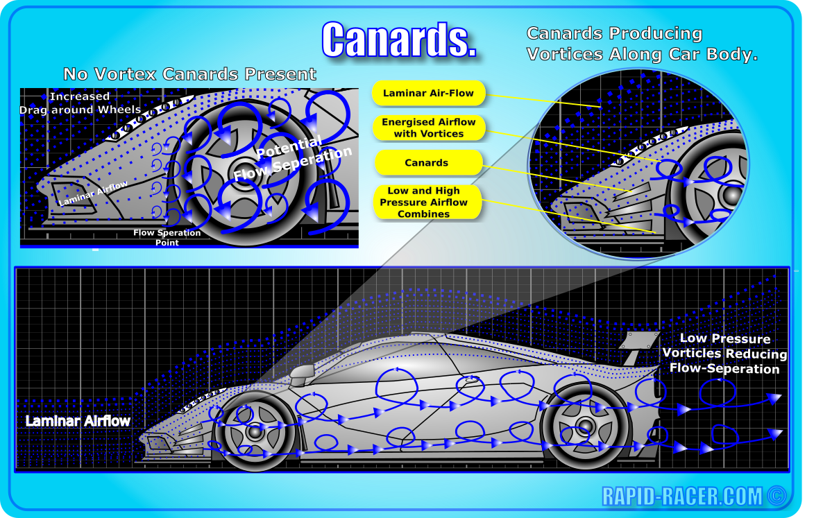 카나드가 제대로 설치되면 차량 옆면에서 차량 아래로 흐르는 공기를 차단하는 에어커튼을 만들어내 차량이 다운포스를 지속적으로 유지할 수 있도록 합니다. 그리고 무엇보다 간지 향상 최예템! 하지만 공도에서 과한 길이는 사람들에게 피해를 줄 수 있습니다.