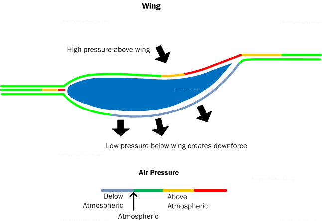 어쨌든, 날개 아래 공간을 지나는 바람이 날개의 기울어진 밑면을 타고 빠르게 흐르게 되는데 이때 윗면에서 발생한 높은 기압이 날개 밑면을 타고 흐른 낮은 기압을 밀어내면서 다운포스를 만들어 냅니다.