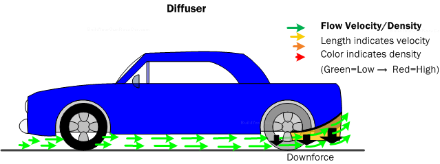 리어 디퓨저는 에어 댐, 사이드 스커트와 일심동체입니다. 에어 댐과 사이드 스커트는 차량 밑에 적은 양의 공기를 머묾고 있습니다. 이 공기를 리어 디퓨저로 빠르게 내보내야 합니다. 공기가 계속 머물게 되면 리프트가 생겨 차량을 들어 올리기 때문입니다. 차 밑에 머물고 있는 공기를 리어 디퓨저를 통해 빠르게 내보내면 차량 위와 차량 밑 사이의 압력 차이를 크게 만들어 더 많은 다운포스와 타이어 그립력을 증가시켜 안정성을 높일 수 있습니다.