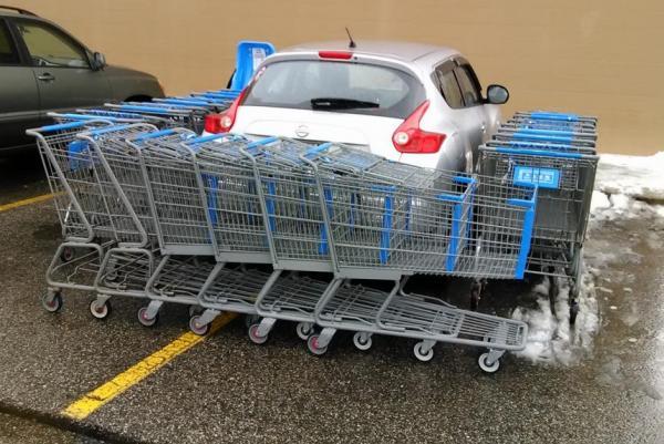 왼쪽 첫 번째 사진도 좋은 방법이다. 하지만 더욱 견고한 쇼핑 카트 결계는 오른쪽 사진처럼 서로서로 연결하는 것이다. 창고형 회원제 마트를 제외하고는 대부분 동전을 넣어야 하기 때문에 동전이 없어서 고생 좀 하길 바라본다.