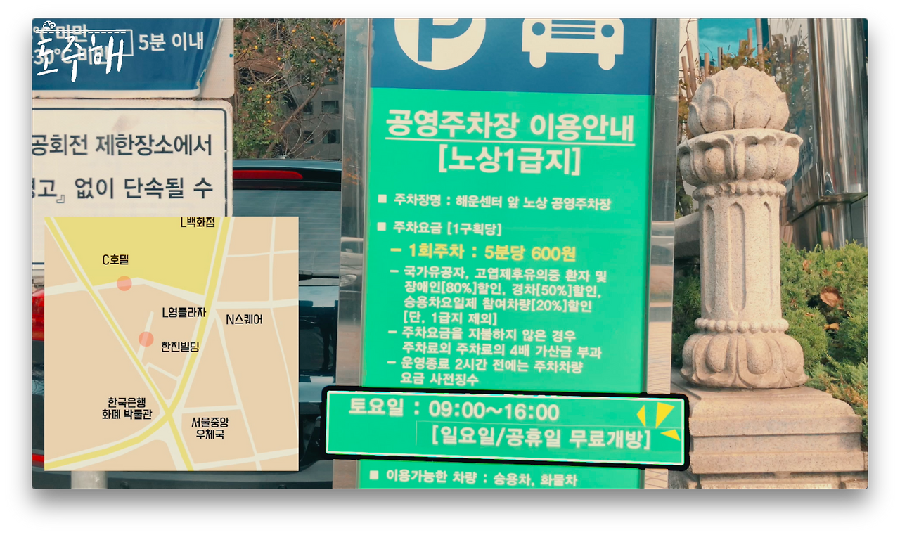 OCI건물 앞과 조선호텔 앞이 이렇게 작지만 무료로 열리는 무료 주차공간!!!