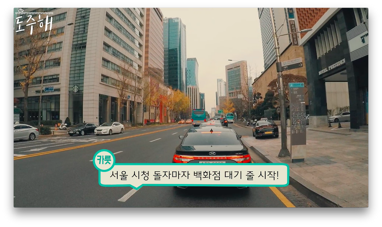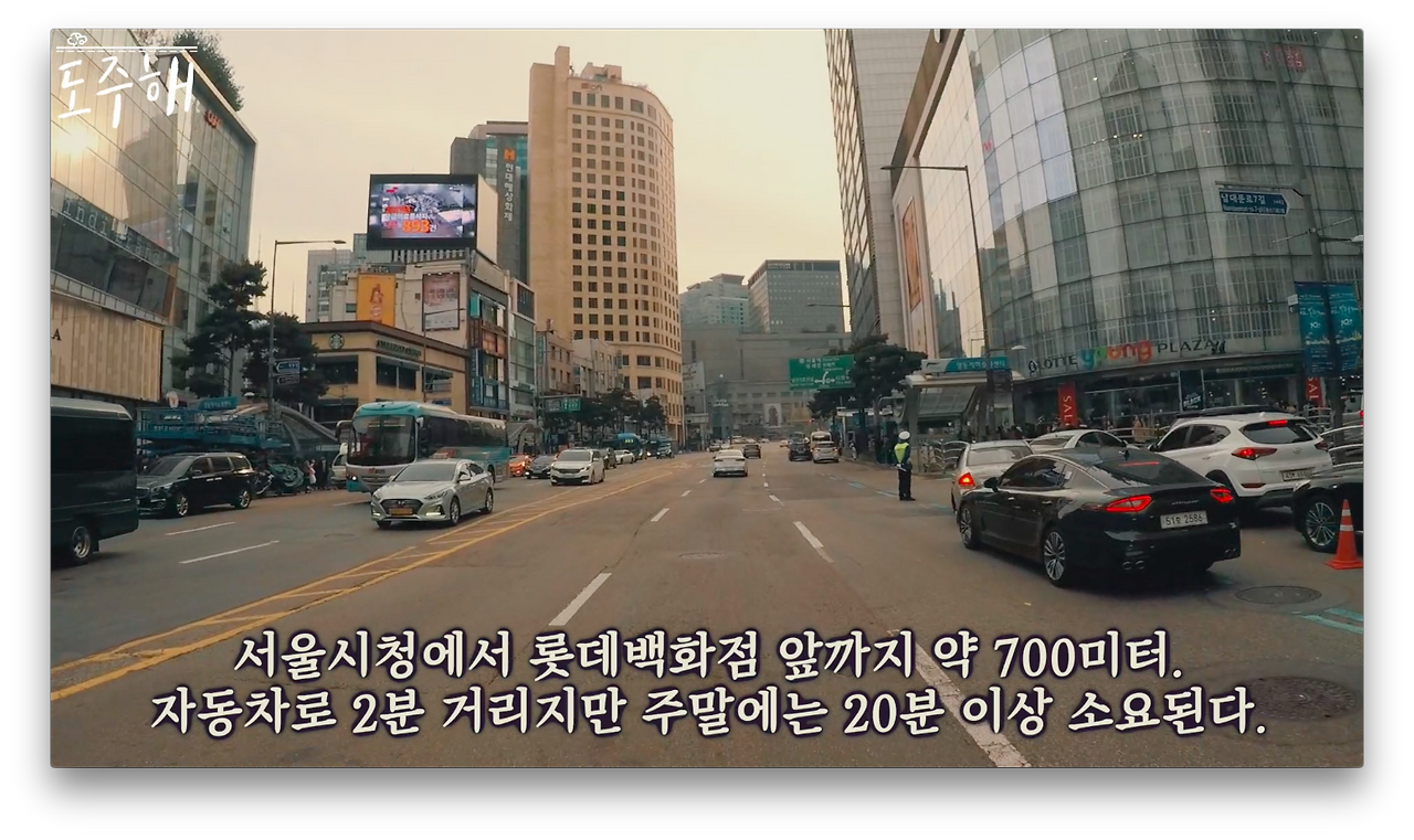 을지로 1가 사거리는 실제로 약 2분 거리이지만 주말에는 20분 이상 소요되는 정체구간 입니다.