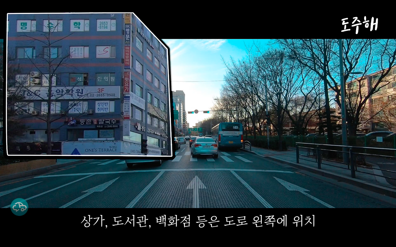 도로 왼쪽에는 상가, 백화점, 도서관 등이 위치하고 있으며