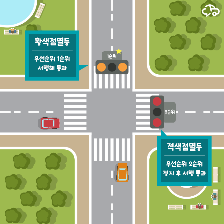 규모가 작은 3지(T자 교차로), 4지(+자 교차로)의 경우에는 점멸등의 색에 따라 통행 우선순위가 다르다. 서행하면서 통과하는 황색 점멸등이 1순위, 일시 정지 후 서행해 통과해야 하는 적색 점멸등이 2순위가 된다. 즉, 황색 점멸등에게 통행우선권이 있으며 황색과 적색 점멸등이 설치된 교차로에서 사고 시 이에 따라 사고 비율이 달라져 피해자가 가해자로 바뀌는 일도 흔하게 발생한다.
