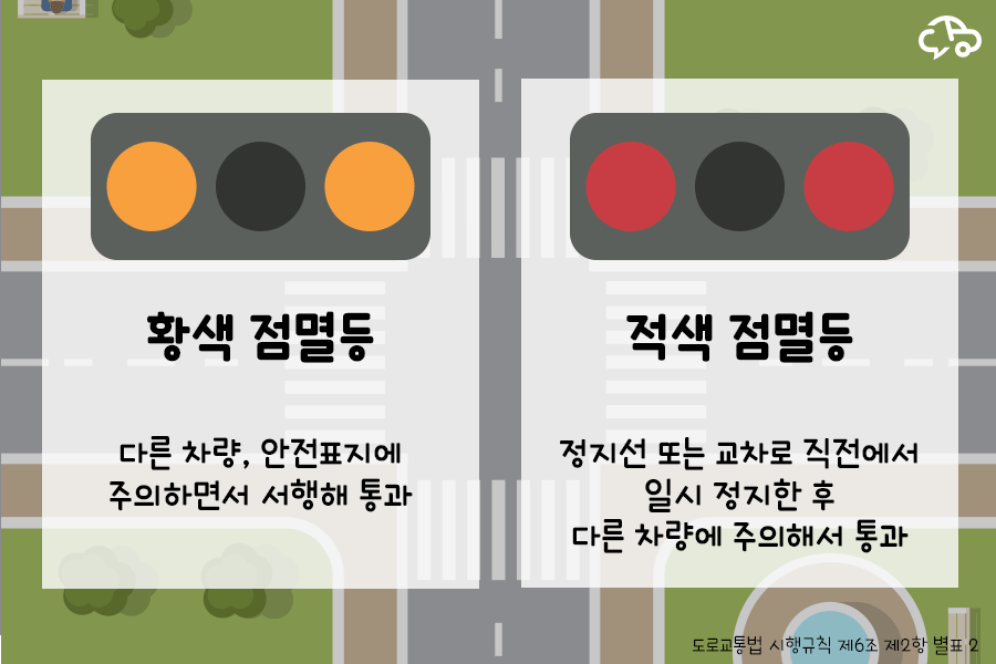 낮에는 분명 일반 신호등이었는데, 저녁엔 황색 또는 적색 점멸등으로 바뀌어 있는 신호등. 평소처럼 통과하긴 했는데 뭔지를 모를 찜찜함은 무엇! 룸미러로 뒤따라 오는 차량은 어떻게 통행하는지 궁금하긴 한데, 갈 길이 너무 바쁘다. 황색, 적색 점멸등 신호등은 대체 어떻게 지나가야 할까?