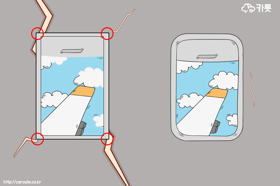 이와 같은 이유로 비행기 창문을 직사각형이 아닌 둥근 창문으로 만드는 것입니다. 사각형은 강한 충격을 받으면 독립된 네 개의 모서리에 충격이 집중됩니다. 하지만 모서리를 둥글게 만들면 힘이 분산되기 때문에 파손될 가능성이 줄어들게 됩니다.