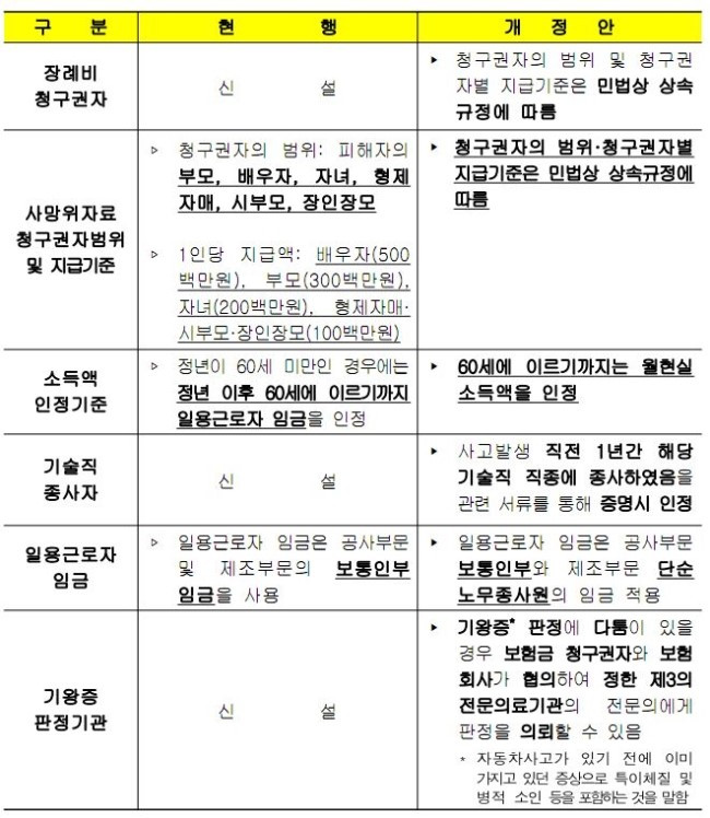 사람 목숨이 수입차 한 대 값보다 못하다는 말 이해가 됩니다. 개정 전에는 보상 금액이 적다 보니 대다수 피해자들은 소송을 제기할 수밖에 없습니다. 더욱 황당한 건 이미 법원에서는 2016년 3월부터 교통사고 사망자에 대한 위자료 기준금액을 8,000만 원에서 1억 원으로 올려 적용하고 있었다고 합니다.