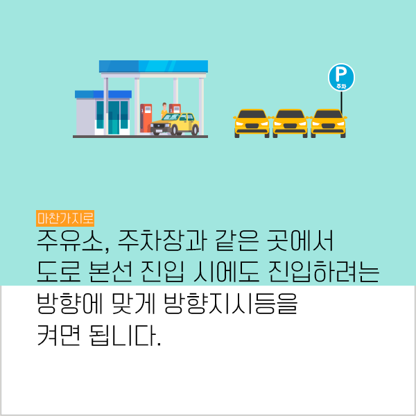 일반 도로가 아닌 주유소, 주차장과 같은 곳에서 도로 본선 진입 시에도 진입하려는 방향에 맞게 방향지시등을 켜야 한다.