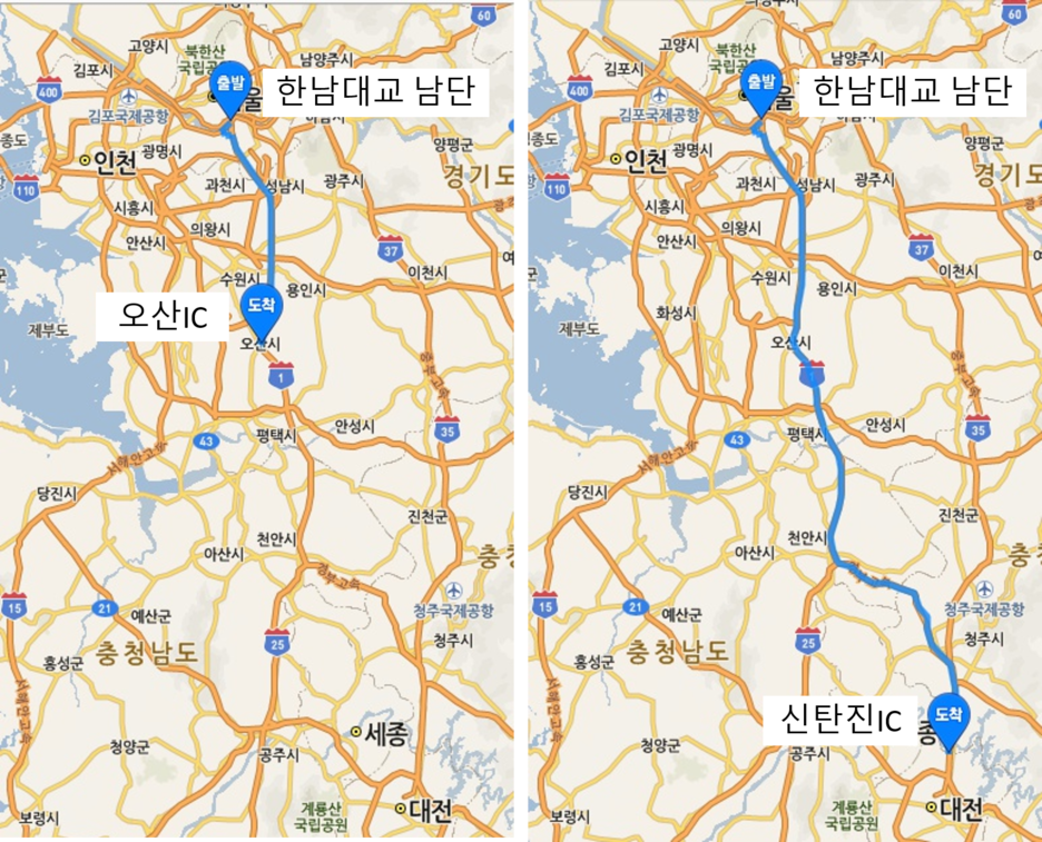 구간은 어디부터 어디인지 글로 보면 참 애매하죠. 알기 쉽게 지도에 표시해봤어요. 왼쪽은 평일 적용 구간 / 오른쪽은 주말, 연휴 적용 구간 입니다. 하지만 명절, 황금연휴 기간 동안에는 구간, 단속 시간 등이 달라지거나 늘어날 수 있습니다.