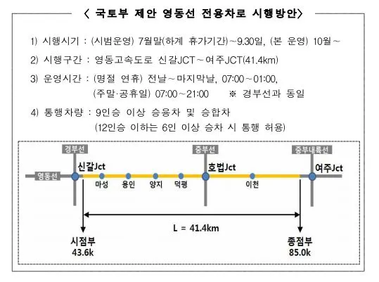 이르면 이번 2017년 10월부터 영동고속도로 신간~여주 분기점 구간 41.4km에 대해 주말동안 버스전용차로 신설 되는데요. 7월말 부터 시범적으로 운영된다고 합니다. 10월 추석연휴 기간 전까지 시범운영 후 교통량과 분산효과 등을 파악 후 버스전용차로 신설 효과에 따라 서울~오산나들목 평일 경부선의 버스 전용차로를 서울~천안분기점 까지 확대하는 방안이 검통 중이라고 합니다.