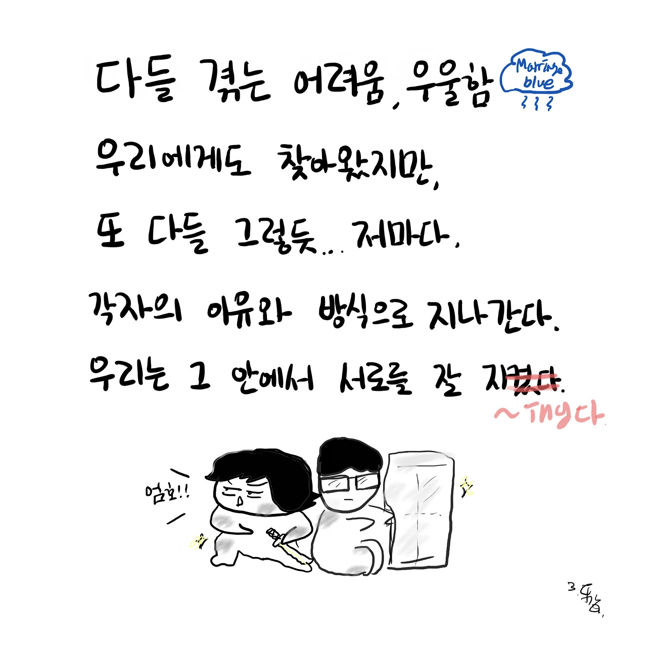 #궁깡웨딩일기 01 짧은 기간이었지만 서로와 자신을 의심하고 시험하는 순간이었던 것 같당. 지금은 얘네 왜이래 싶었고 그려야하나 고민했지만, 그럼에도 괴로워하고 이겨낸 시간을 남겨놔야 할 것 같은 생각이 들었다. 우리만 겪는 일이 아니구나가 젤 위로가 되는 지점 같은데 마찬가지로 또다른 시작을 여는 사람들에게 나또한 보탬이 되길 바람. 아직도 불안이 없다면 거짓말이지만 신뢰가 더 크기에!!