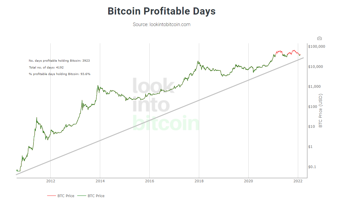 비트코인 역사 중 92%가 이익을 보고 있으며 현재 마이너스인 투자자는 8%에 불과합니다. 심지어 17년도 말, 광기의 끝에 샀던 사람들도 현재 수익을 보고 있습니다. 이게 가능한 이유는 위에서 이야기했던 것처럼 공급은 정해져 있는데 시간이 지날수록 사람들의 관심이 늘어남과 동시에 투자가 세계적으로 이루어져 수요가 늘어나기 때문이라 생각합니다.