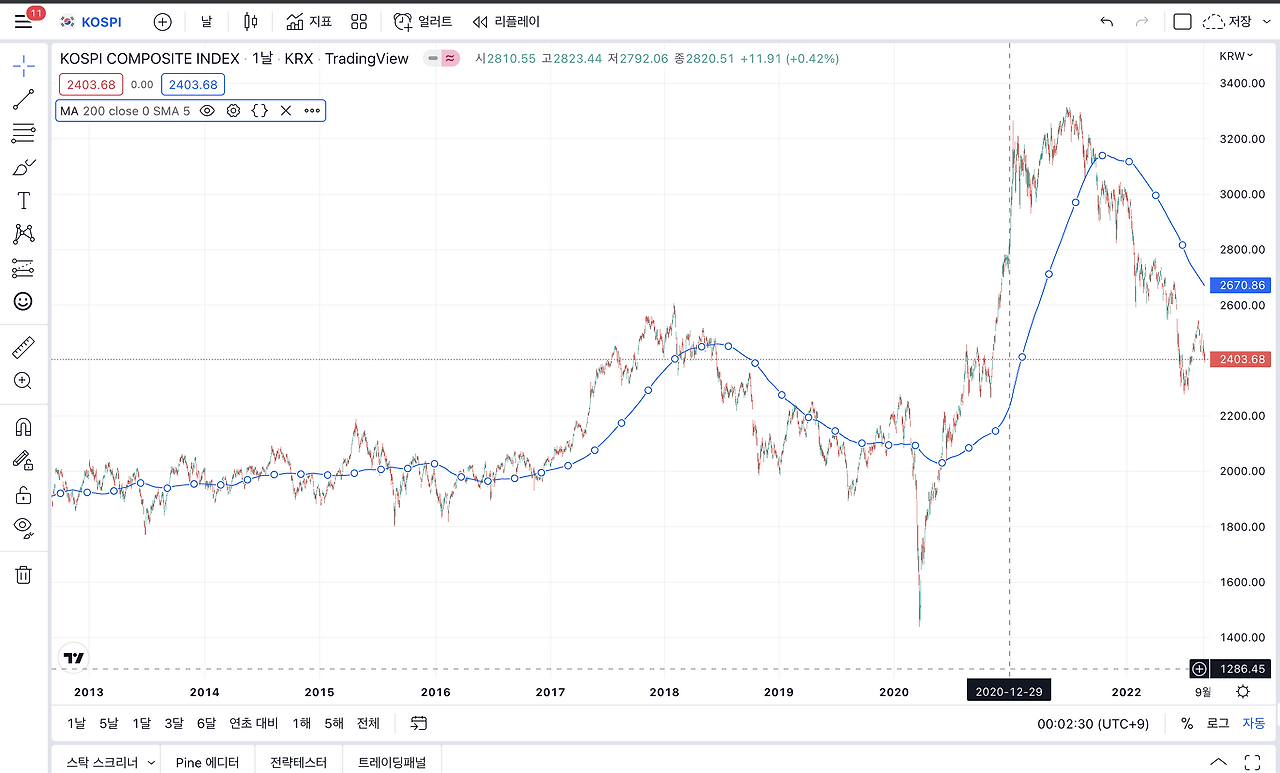 이동 평균선(=이평선)의 정의는 "일정 기간 동안의 가격을 산술 평균한 값인 이동평균을 차례로 연결해 만든 선"입니다. 쉽게 설명하면 "200일 동안 가격으로 평균값 내고 선 그은 거야~"입니다. 그래서 기간이 짧을수록 차트의 흐름과 비슷하게, 길수록 장기 추세를 확인할 수 있습니다. 그 적당선이 200일 이평선입니다. 현재 코스피만 봐도 200일 이평선 아래에 있는 것을 확인할 수 있습니다. 이럴 때 조금씩 줍줍 하면 미래엔 빛을 볼 거라 생각이 듭니다.