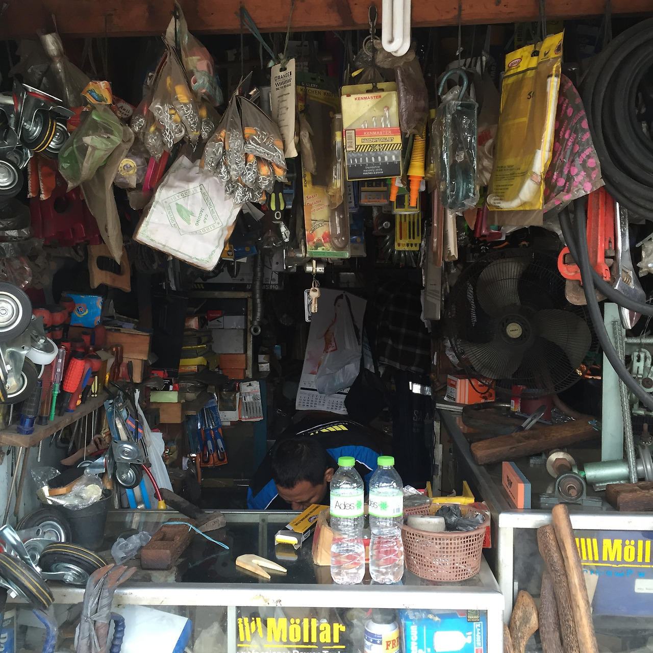 괜찮은 공구를 찾겠다는 일념으로 자카르타 Glodok이라는 동네를 샅샅이 헤매고 다녔다. Glodok은 한국의 청계천과 비슷한 지역이다. 각종 공구 상점이 몰려 있는 지역인데, 골목의 바닥은 찌든 때가 겹겹이 쌓여 있어서 신발을 신고도 땅을 함부로 밟기가 겁났다. 몇 걸음 걸으니 신발에 검댕이 묻어서 금방 까매졌다. 신발은 포기하고 그냥 연장이나 빨리 찾자. 기온은 30도를 훌쩍 넘는데, 호그와트 미로 같은 Glodok 뒷골목에는 바람 한 점 들어오지 않았다. 땀으로 샤워를 하며 골목을 누볐다. 뒷골못 구석진 곳에서 드디어 꽤나 번듯한 공구 상점을 하나 발견했다! 가게에 들어서자마자 일본제 줄자와 버니어 켈리퍼스 같은 연장들이 눈에 들어왔다. 아! 내가 원하던 연장들이다! 한국에서는 그 존재를 당연하게 여겼던 고마운 연장들. 그런데 문제는 상점에 재고가 충분치 않다는 것!