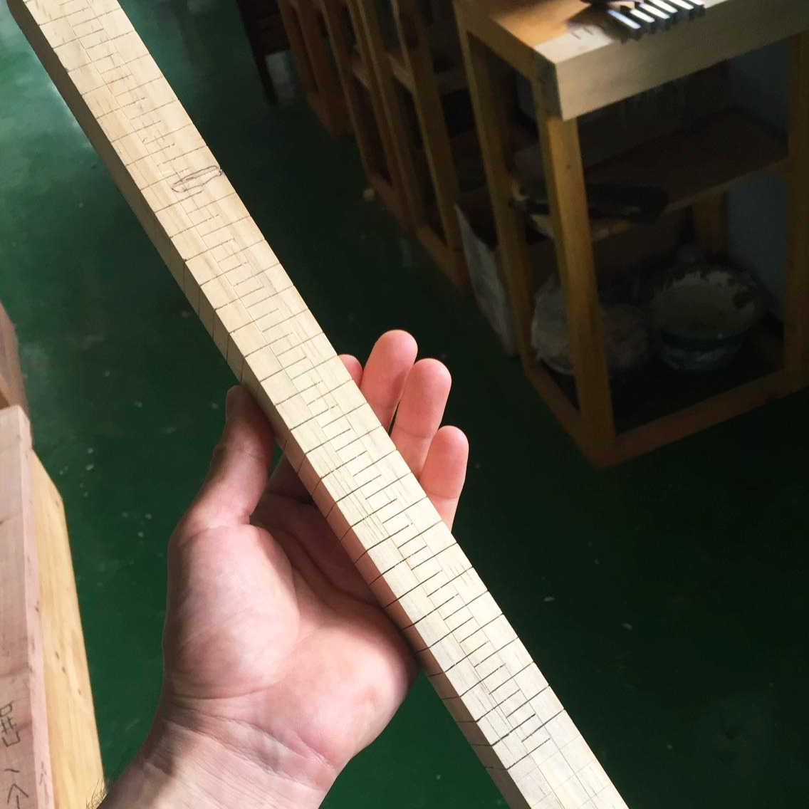 학생들에게 톱질을 내가 배운 대로 가르쳐 보기로 했다. 각재를 준비한 다음 일정한 간격으로 칼금을 긋고, 선에 맞춰서 톱질 연습을 하는 것이다. 30x30mm 각재에 그은 칼금을 옆에서 보면 대략 이런 모양이다.