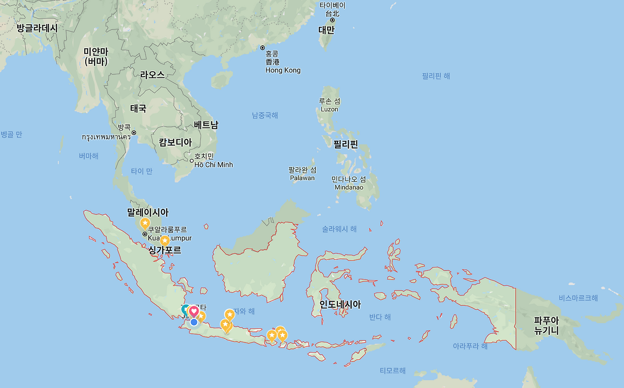 지도에서 붉은 선으로 표시된 부분이 인도네시아다. 대충 비교해봐도 아시아 대륙 남쪽에 붙어 있는 태국, 베트남, 라오스, 캄보디아, 필리핀과 말레이시아를 합친 것보다 크기가 더 크다. 이 커다란 나라에는 각종 천연자원과, 눈부시게 아름다운 자연경관이 이 섬 저 섬에 무수히 숨겨져 있다. 아직 발견되지 않은 천연자원도 많고, 개발되지 않은 여행지도 무수히 많다.