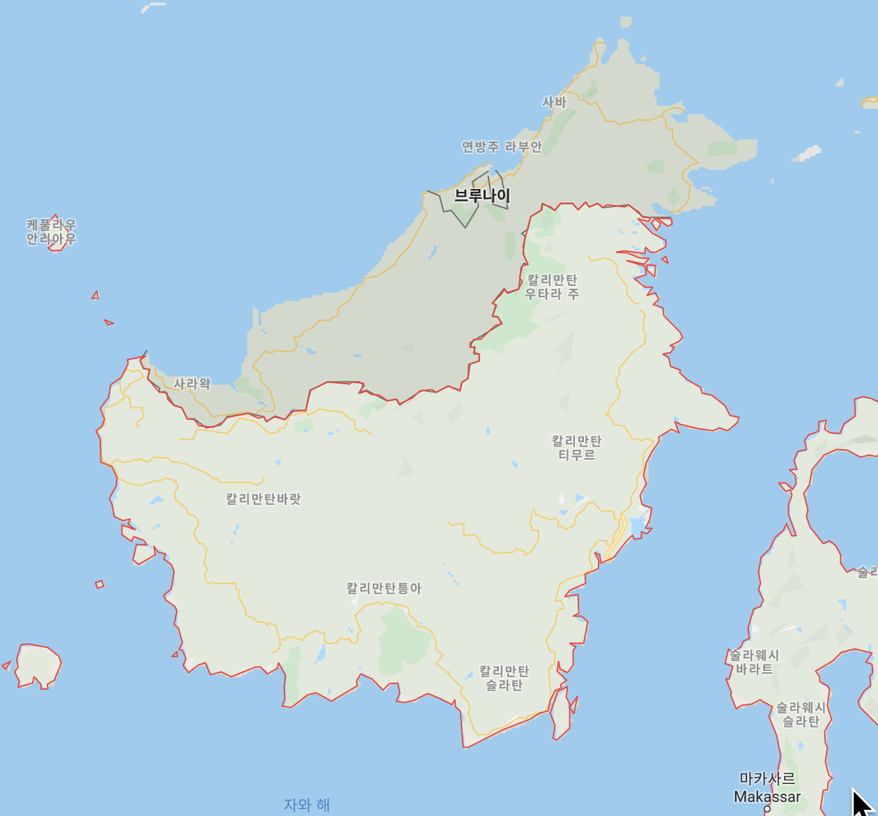 보루네오 섬의 북쪽은 말레이시아 영토고, 한 쪽 구석에는 브루나이라는 작은 나라도 있다.